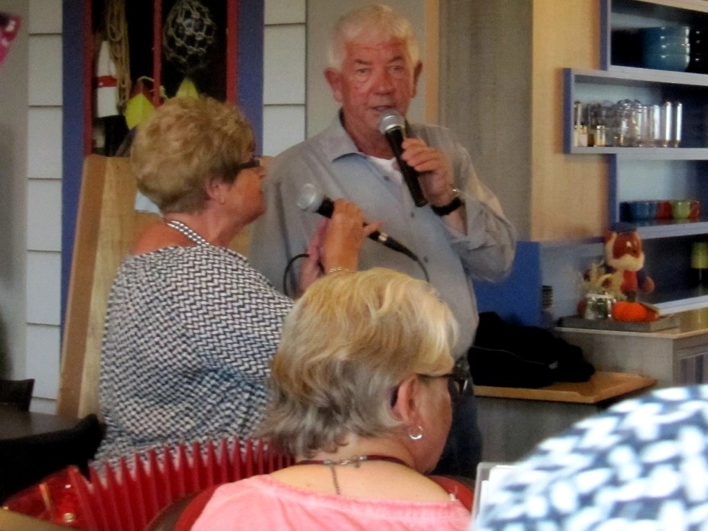 Men was o.a. in Friesland geweest en daarom pasten ook een aantal Friese liederen prima in het repertoire. De vrijwilligers waren weer druk bezig iedereen een plaatsje te bezorgen in het knusse zaaltje. Het koor stond ook deze keer onder leiding van Geert Dijkstra en de begeleiding werd verzorgd door de accordeonistenJoze Boon en Truida van Santen.