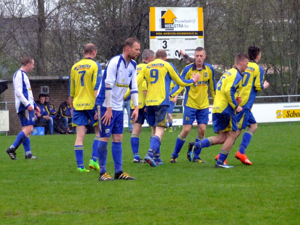 Nadat Jan Tijtsma al tweemaal oog-in-oog met keeper Hoiting had gefaald was driemaal scheepsrecht en wist hij via een knappe counter de 2-1 tegen het net te werken. Vlak voor rust wist Arend Castelein de stand dan toch op 2-2 te brengen nadat hij uit een voorzet de bal achter keeper Dijkstra kopte. Wederom kon WTOC niet lang genieten van de voorsprong want direct vanaf de aftrap was het Erik Bruinsma die in een aanval van Anjum met een kopbal onfortuinlijk zijn eigen keeper wist te passeren, 3-2. Scheidsrechter Brinkhuizen floot hierna direct voor de thee.