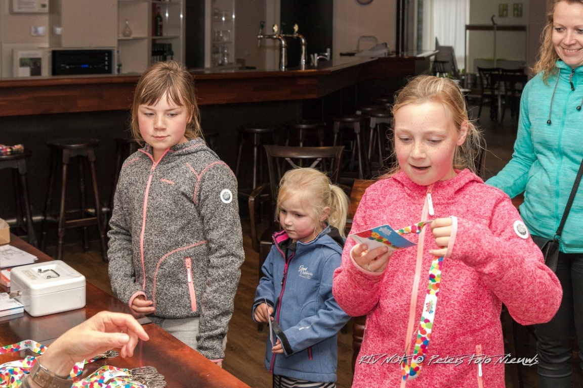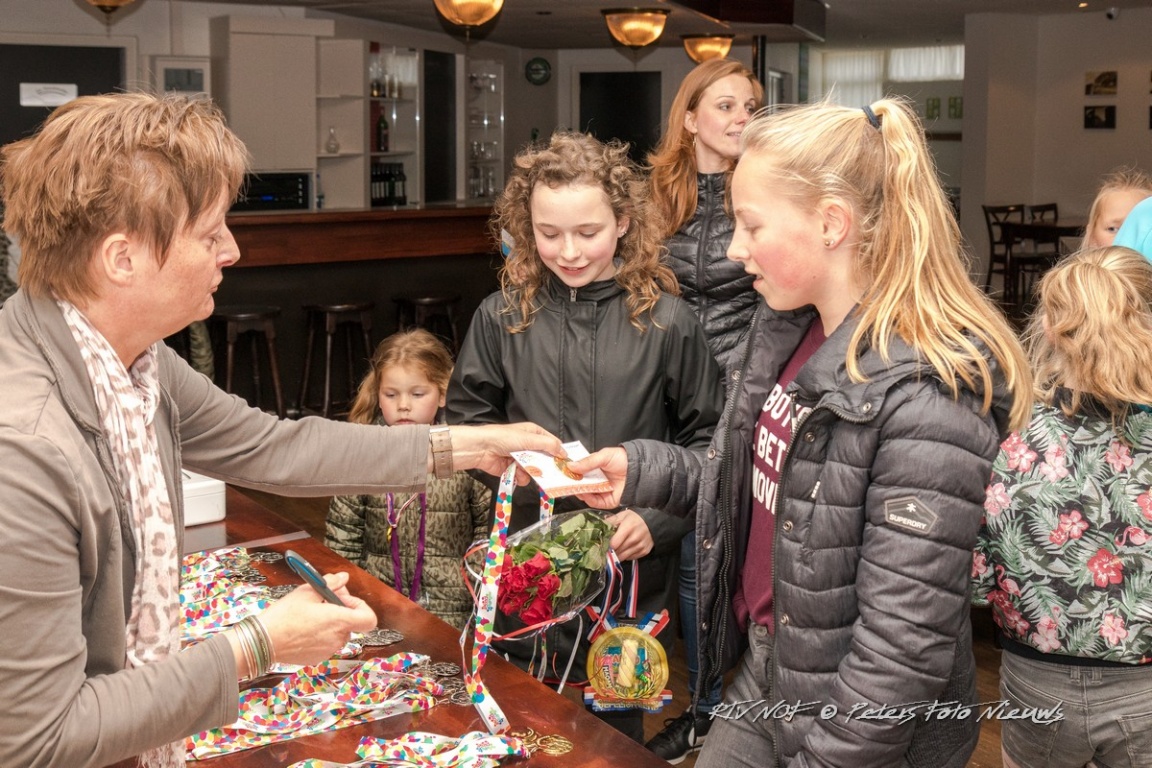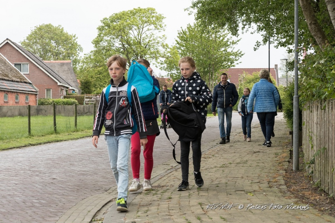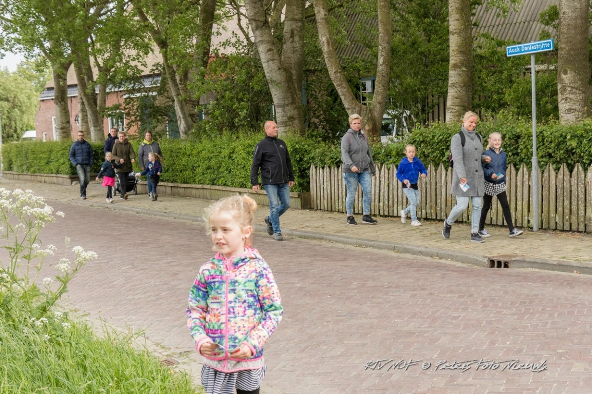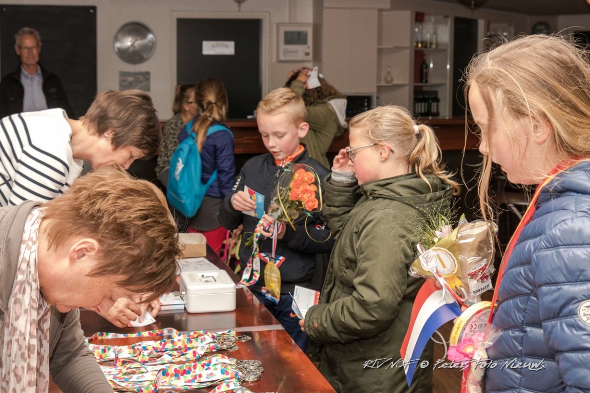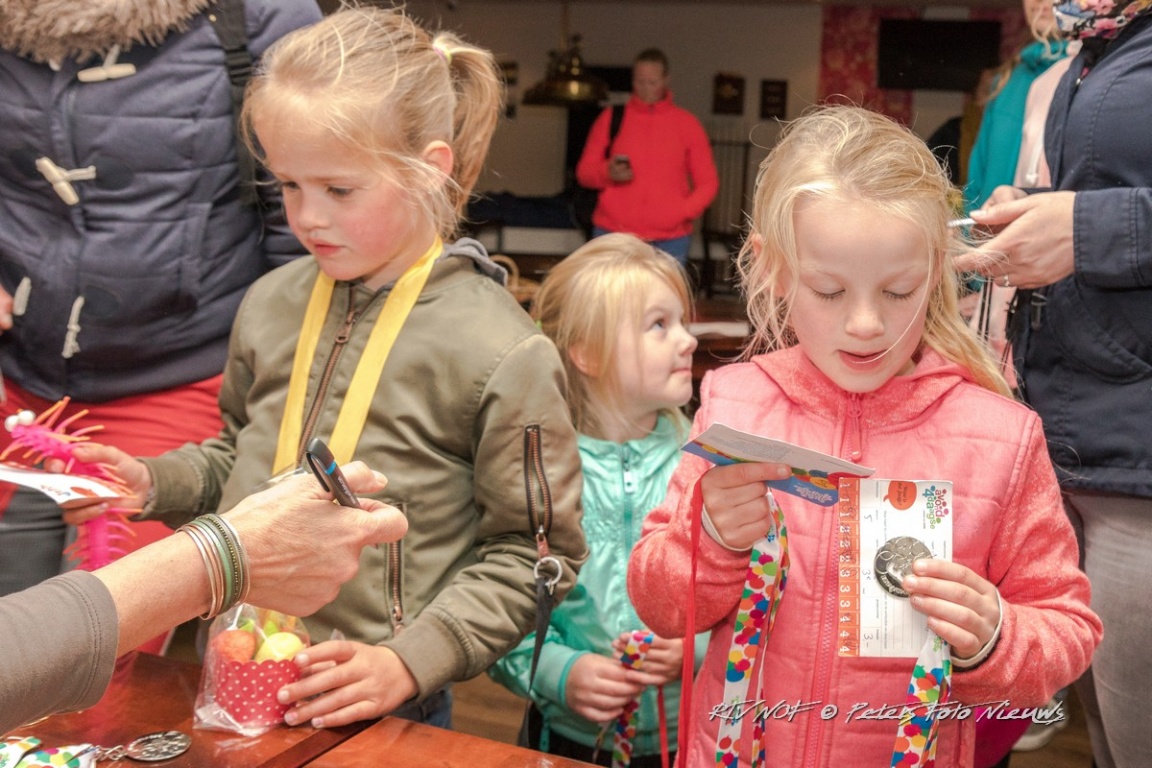 Inmiddels stonden er bij het dorpshuis ouders, pake’s, beppe’s, opa’s en oma’s of andere bekenden te wachten met bloemen en beloningen. De deelnemers werden zo binnen gehaald en beloond voor hun prestatie. Snel naar binnen voor het laatste stempeltje en natuurlijk waar alles om draait, de felbegeerde medaille. Allemaal trotse gezichten toen ze deze in ontvangst namen. Djoke Howerda liep dit jaar voor de 31 keer mee en kreeg dan ook extra waardering voor haar trouwe deelname. De organisatie laat weten dat ze zeer tevreden zijn over het verloop en danken een ieder voor de deelname.