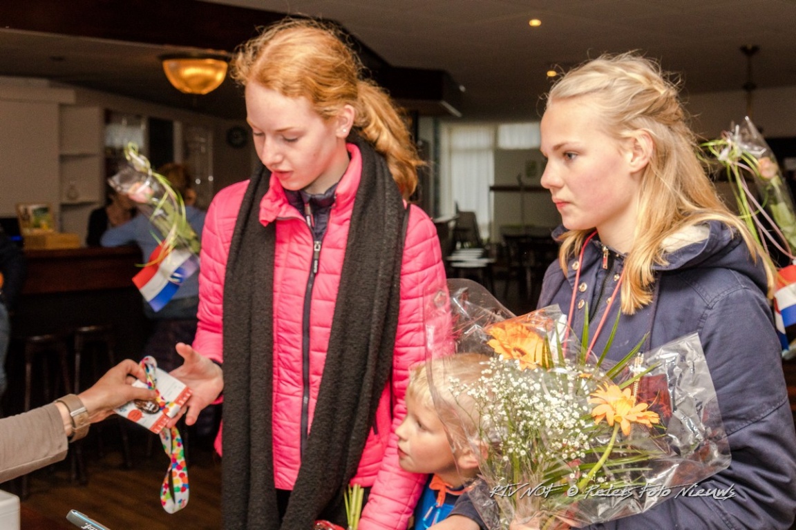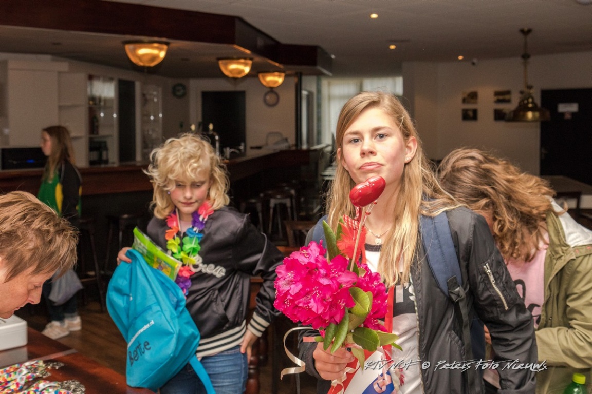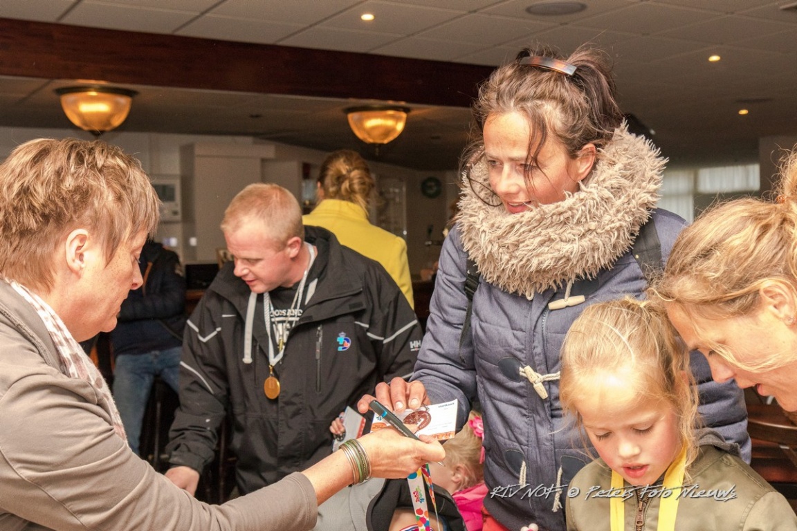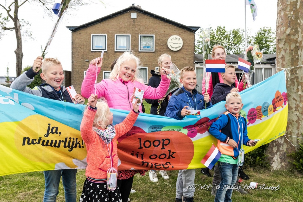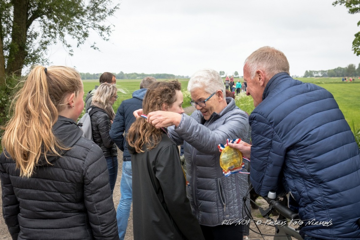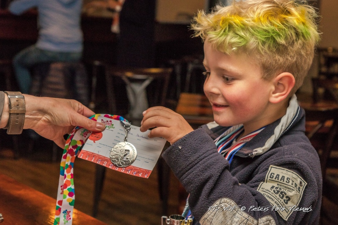 Inmiddels stonden er bij het dorpshuis ouders, pake’s, beppe’s, opa’s en oma’s of andere bekenden te wachten met bloemen en beloningen. De deelnemers werden zo binnen gehaald en beloond voor hun prestatie. Snel naar binnen voor het laatste stempeltje en natuurlijk waar alles om draait, de felbegeerde medaille. Allemaal trotse gezichten toen ze deze in ontvangst namen. Djoke Howerda liep dit jaar voor de 31 keer mee en kreeg dan ook extra waardering voor haar trouwe deelname. De organisatie laat weten dat ze zeer tevreden zijn over het verloop en danken een ieder voor de deelname.