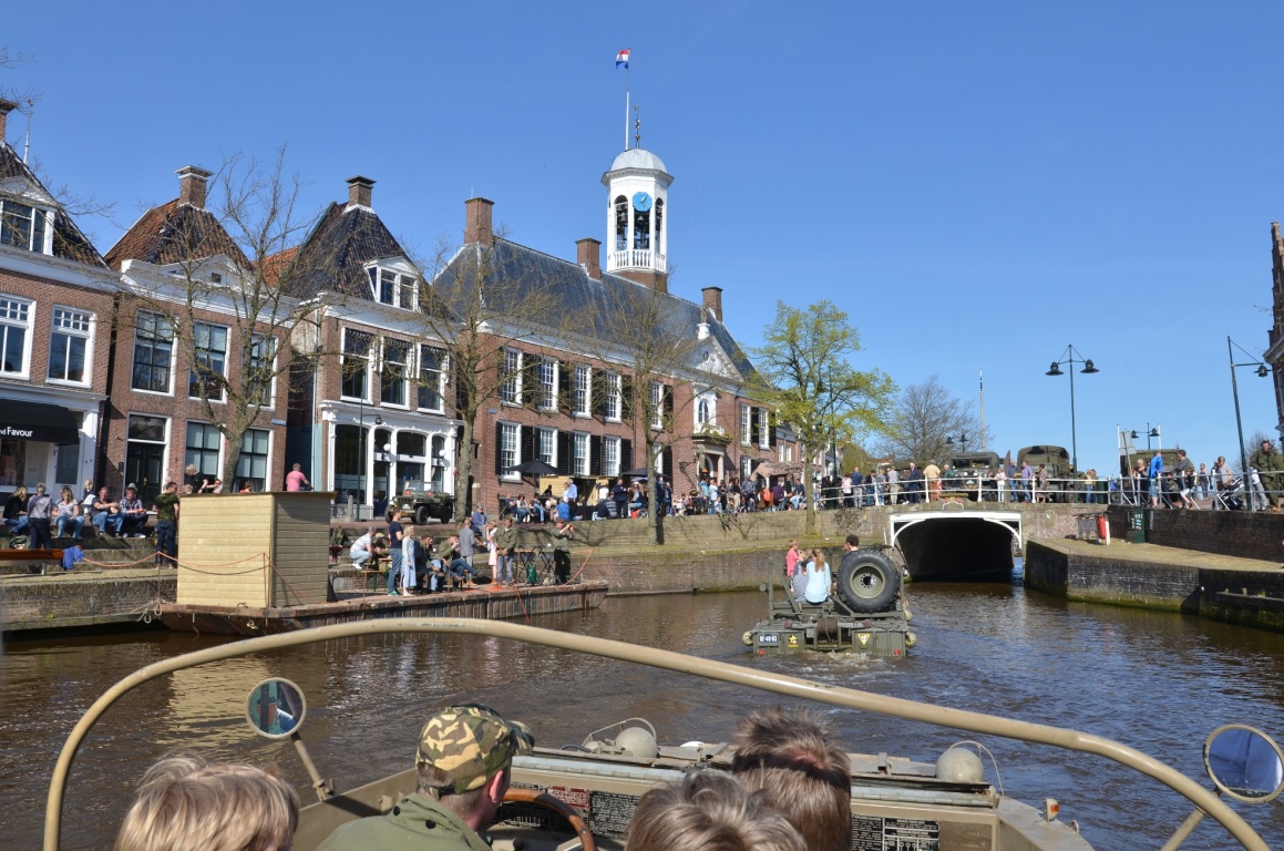 Heel bijzonder was de deelname van twee zogeheten Duk’s, amfibievoertuigen die de landing in Normandië hebben meegemaakt. De ‘autoboten’ gingen bij de nieuwe trailerhelling aan de Birdaarderstraatweg in Dokkum het water in om even later door het centrum van Dokkum te varen. Daar werden inmiddels de andere deelnemende voertuigen door het massaal toegestroomde publiek bekeken.