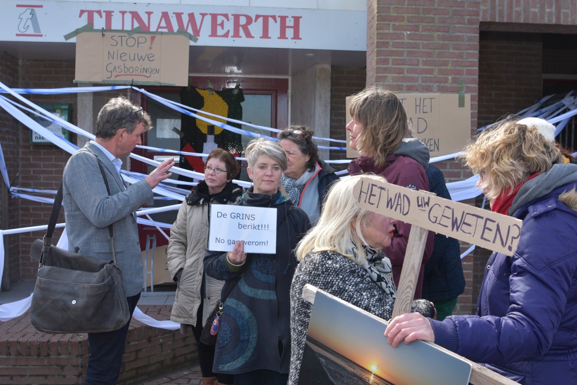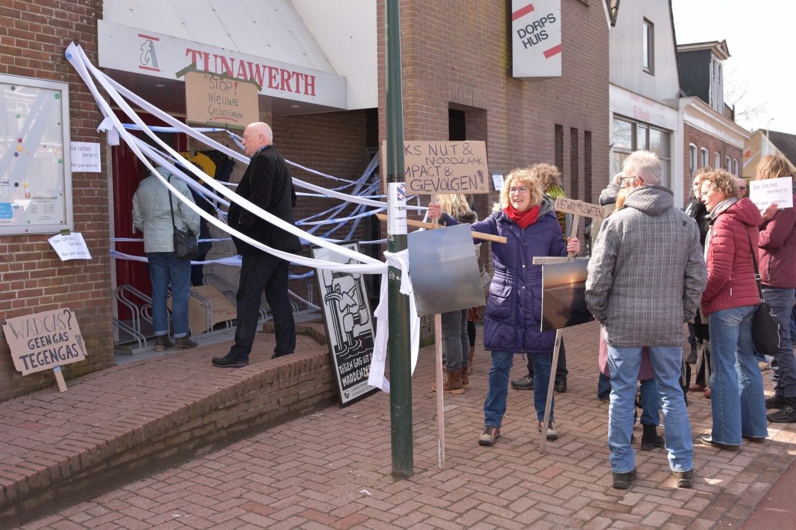 Enige reuring donderdagmiddag bij aanvang van de bijeenkomst over nut en noodzaak van eventuele gasboring bij Ternaard. Actievoerders van Ternaard foar de Wyn, Laat Fryslân niet zakken, Waddenvereniging en andere actiegroepen hadden de toegang tot dorpshuis Tunawerth waar de bijeenkomst woerd gehouden, geblokkeerd met actie borden en linten. Zij willen dat er helemaal niet geboord wordt naar gas. En proberen met deze actie hun woorden kracht bij te zetten. En vonden dus de bijeenkomst voor nut en noodzaak niet nodig.