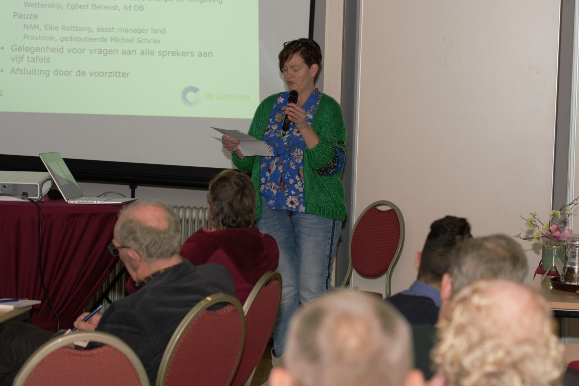 Na de pauze nam Elke Retting, Asset-manager land van de NAM het woord. Ook zij gaf aan dat de NAM graag een duurzame organisatie wil worden en daar ook mee bezig is, alleen de vraag naar gas is nog zo groot dat de omschakeling niet van de ene op de andere dag kan plaats vinden. Gas is simpelweg nog nodig om de boel gaande te houden en daar hoort nieuwe winning nog steeds bij. ‘Waar om wordt er dan gekozen voor Ternaard’ is een vraag die Elke Retting hardop stelt. Het antwoord hier op is vanwege de kosten die gemoeid zijn bij het inrichten van het terrein en het transport naar de behandelingsinstallatie in Anjum.
