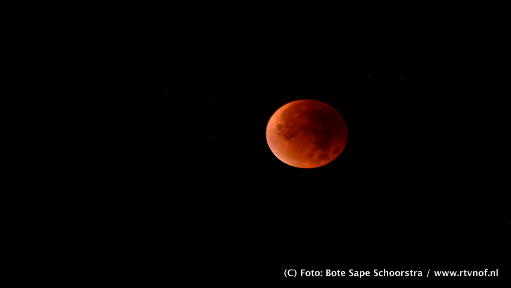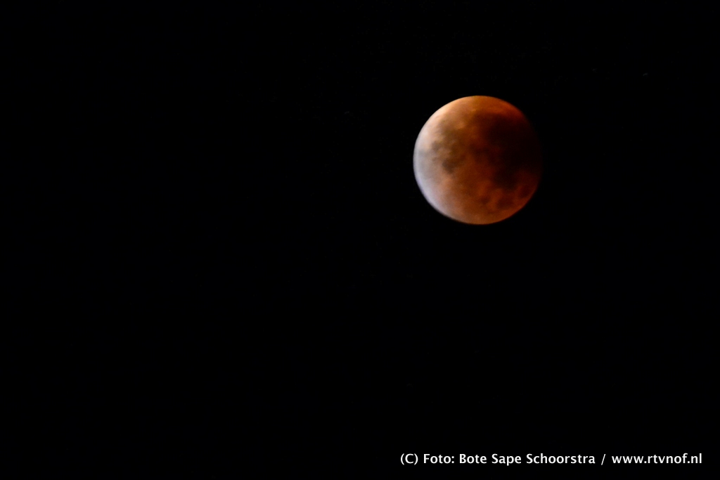 Hoewel niet wolkenloos, was de supermaan-eclips in de nacht van zondag op maandag op veel plaatsen in Nederland goed te zien, zo ook in Ternaard waar onze fotograaf Bote Sape Schoorstra mooie foto’s wist te maken van dit bijzondere verschijnsel.