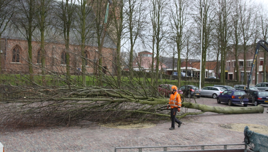 Maandagmorgen is begonnen met het kappen van de bomen aan de oostzijde van de Maartenskerk te Kollum. Reeds jaren ervaren omwonenden overlast van de bomen.