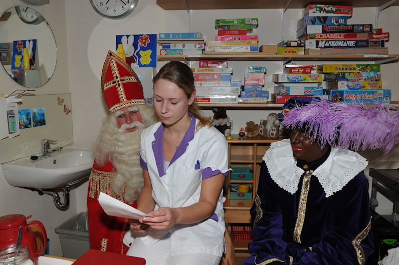 Er was op de kinderafdeling echter geen kind te bekennen, omdat die gisteren allemaal al naar huis mochten wat natuurlijk geweldig is zo vlak voor Sinterklaas. Het speelgoed werd nu in onvangst genomen door de verpleegsters, die natuurlijk eerst een gedichtje aan de Sint moesten voordragen voor dat zij mochten gaan uitpakken en rijkelijk werden voorzien van strooigoed.