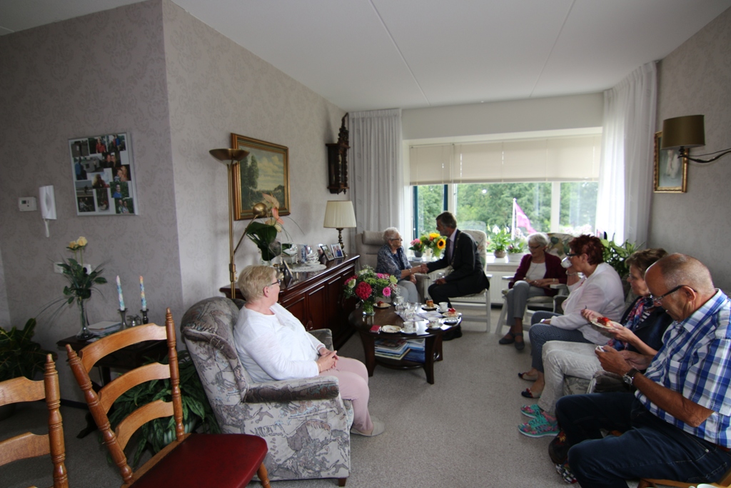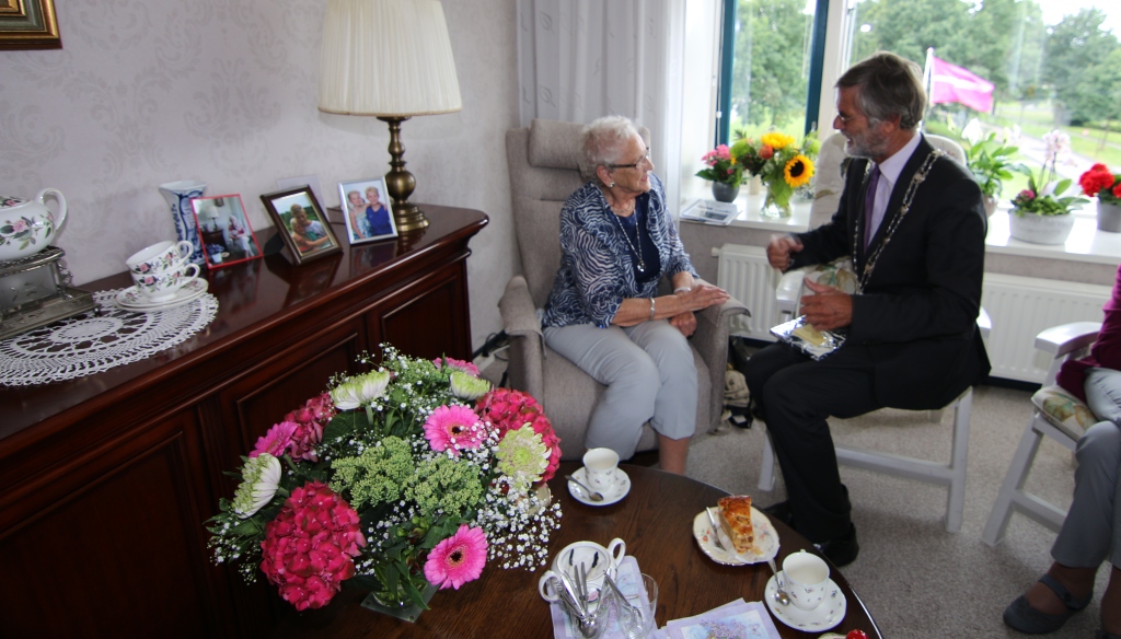 Burgemeester Bearn Bilker van Kollumerland bracht donderdag middag 27 juli een bezoek aan mevrouw Hoekstra-Ruisch in Meckama State te Kollum.