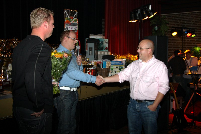 Daarna speelde de band weer een paar liedjes en toen pakte Theo de microfoon met de mededeling dat Henk er dit jaar als bestuurslid met ophoud, hij blijft nog wel als omroeper bij de club. Hij kreeg een envelop met inhoud en een bosje bloemen als dank. Tevens kreeg Henk van een van de bestuursleden een leuk cadeau.Daarna kregen we een muzikale gedeelte en daarna werden de clubkampioen gehuldigd.