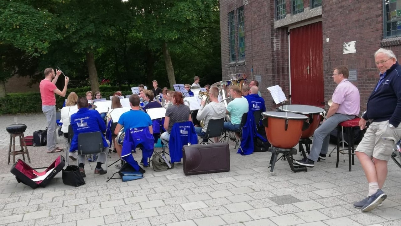Vanwege het mooie weer deze week werd hun vaste repetitieavond in de open lucht gehouden op het plein voor de gereformeerde kerk.