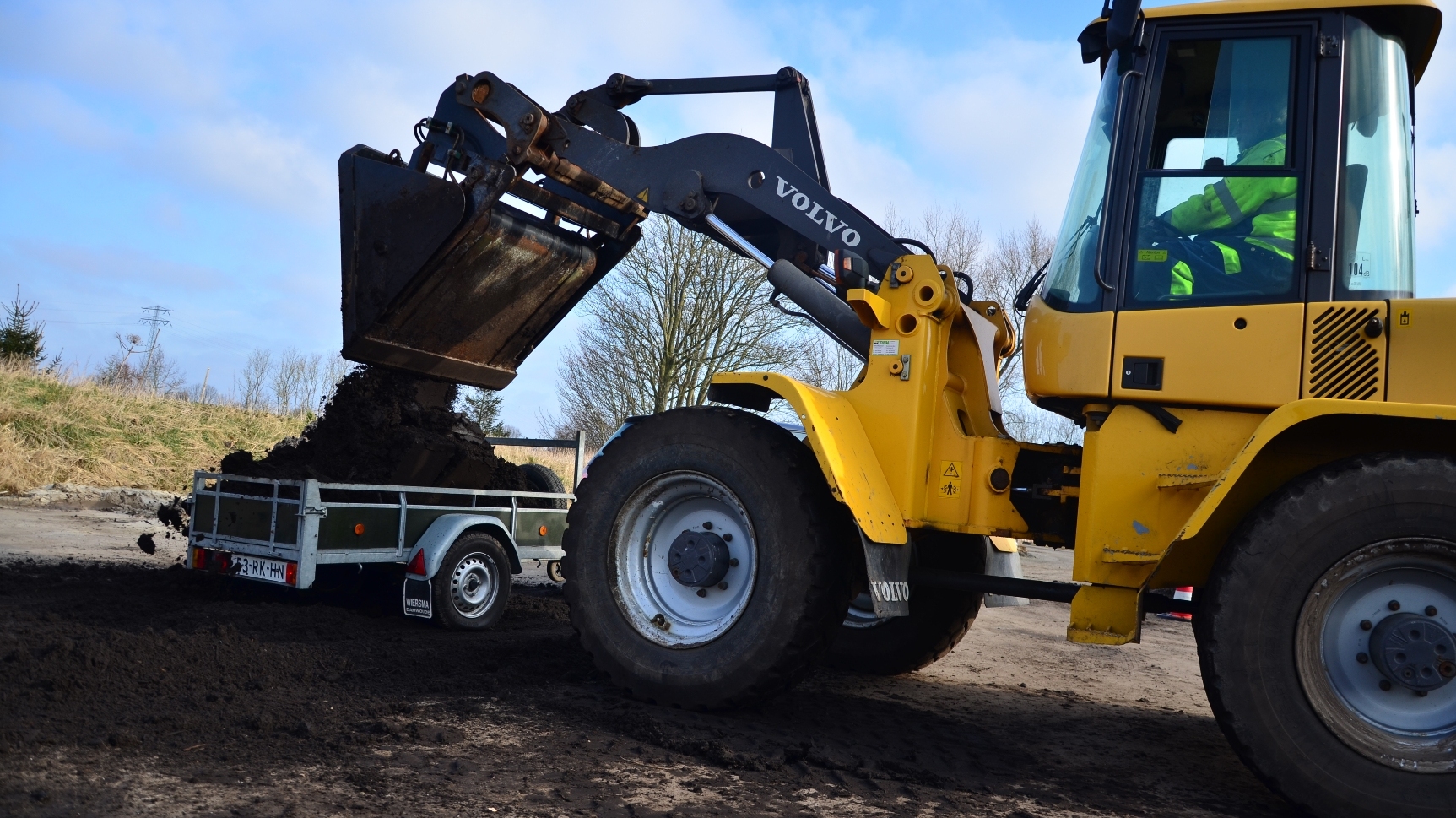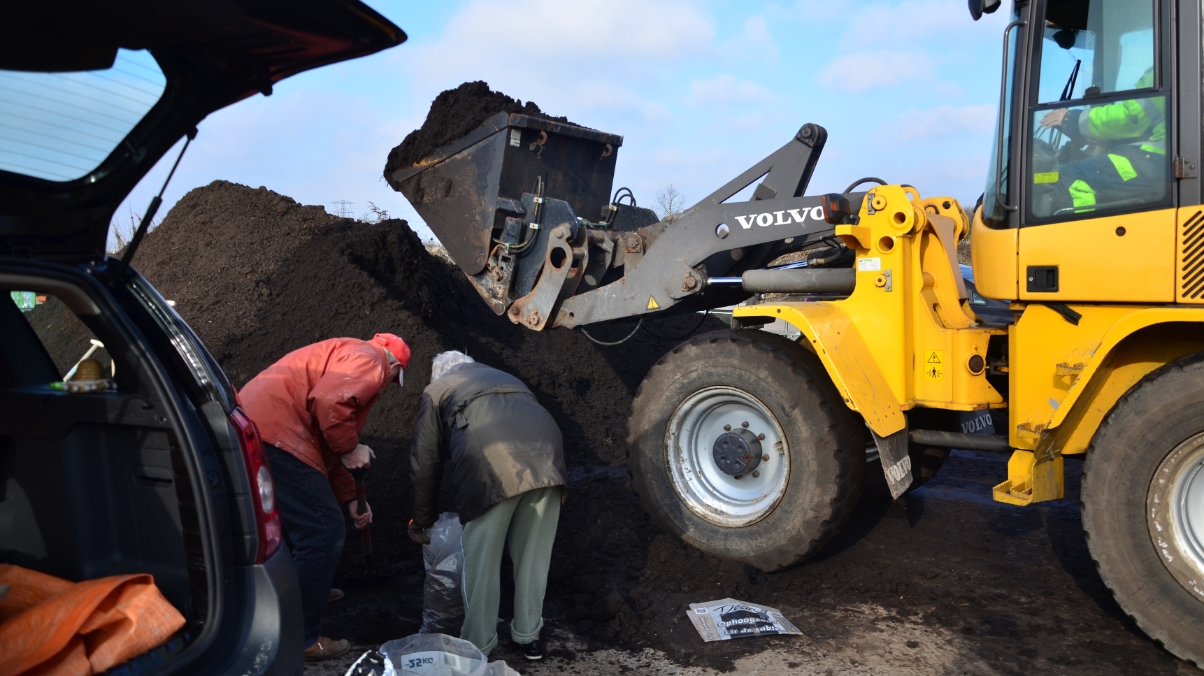 ‘Toen ik hier heen reed waren de bewoners van Clearkamp aan de Birdaarderstraatweg al bezig met het legen van aanhangers bij de heg rondom hun terrein’ volgens Harm Sliep, beheerder van het gemeentelijk terrein aan de Birdaarderstraatweg. En de aanwezige burgers vinden het ideaal weer om de compost over de tuin te brengen: ‘het gewas is nog blad kaal dus je vernielt niets bij het aanbrengen van de compost laag, en van de kou hebt je geen last, je spit jezelf wel warm’. Rond de klok van 12.00 uur was er 100 kuub aan compost weggeven, ‘Ik ha net iens tijd foar koffie’ zegt shovelmachinist Kees van der Zwaag, medewerker bij de afdeling Gemeentewurk van de gemeente Dongeradeel en belast met het vullen van de aanhangers.