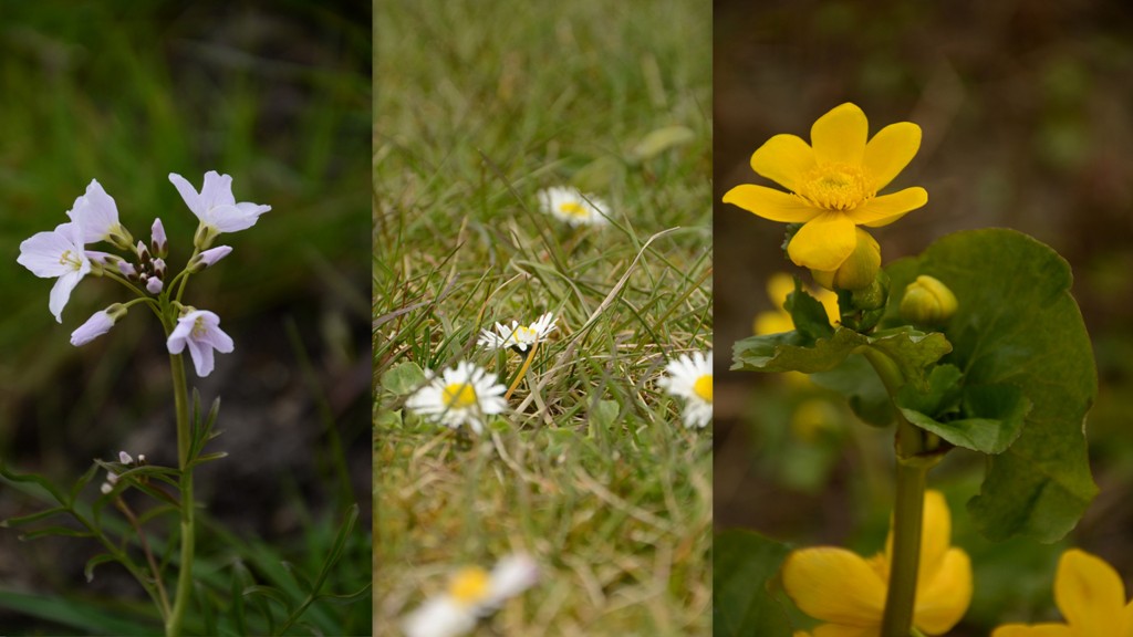 Hooglanders in het Lauwersmeergebied genieten in de zon, de afrastering langs de weg, de Vlinderbalg vaart uit bij het Suyderoogh, in de verte zie je Strandpaviljoen Bosveld , in de berm madeliefjes, richting Zoutkamp even de zon achter de wolken, dotterbloem bloeit weeldig, het is Pasen eerste pinksterbloem gespot, restant van het wateroverlast wat we gehad hebben een paar maanden terug, koningspaard met veulen naast de kwelderweg richting Dokkumer Nieuwe Zijlen