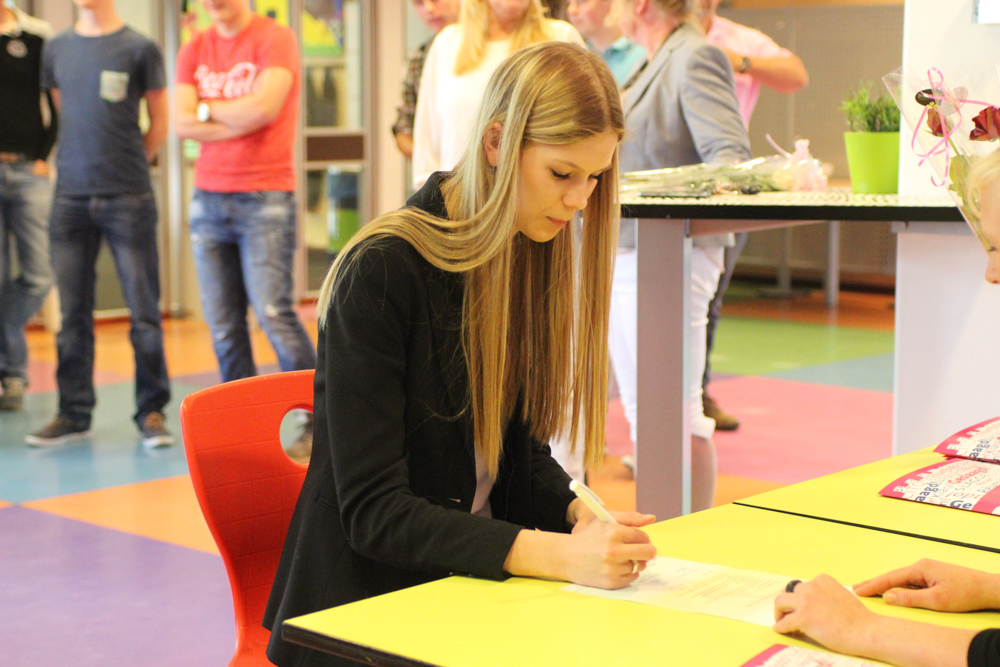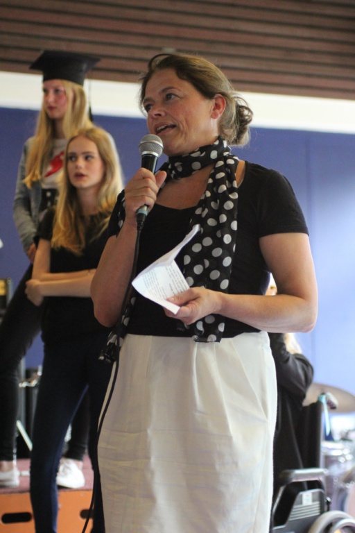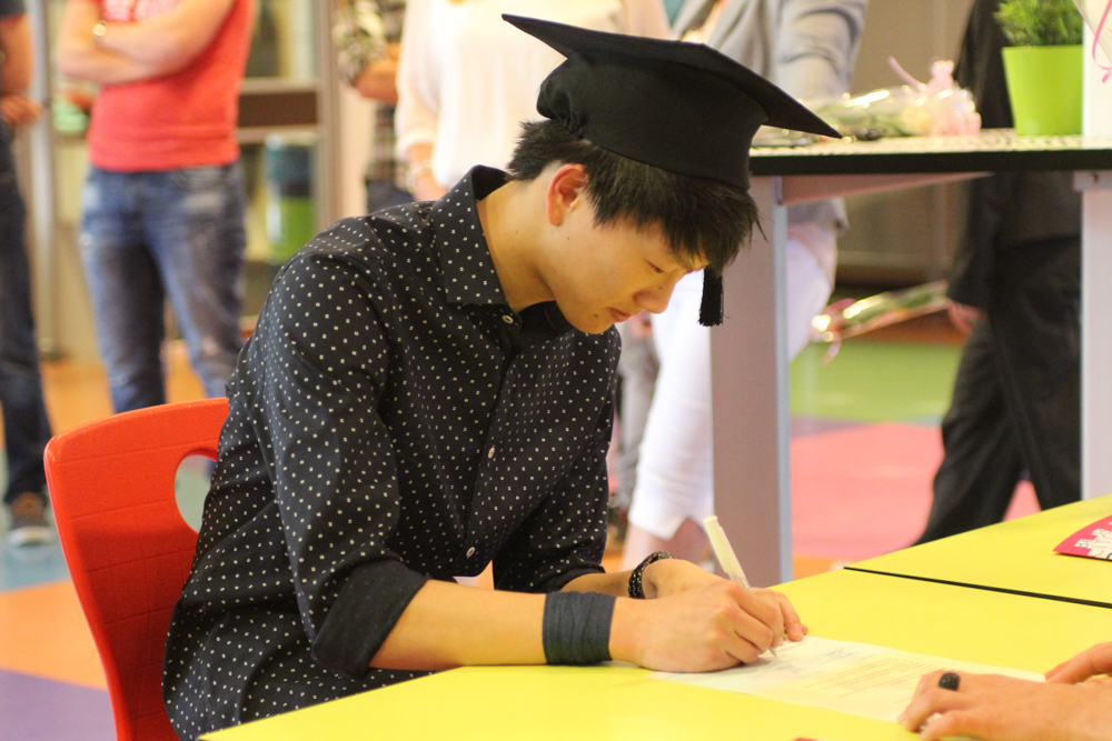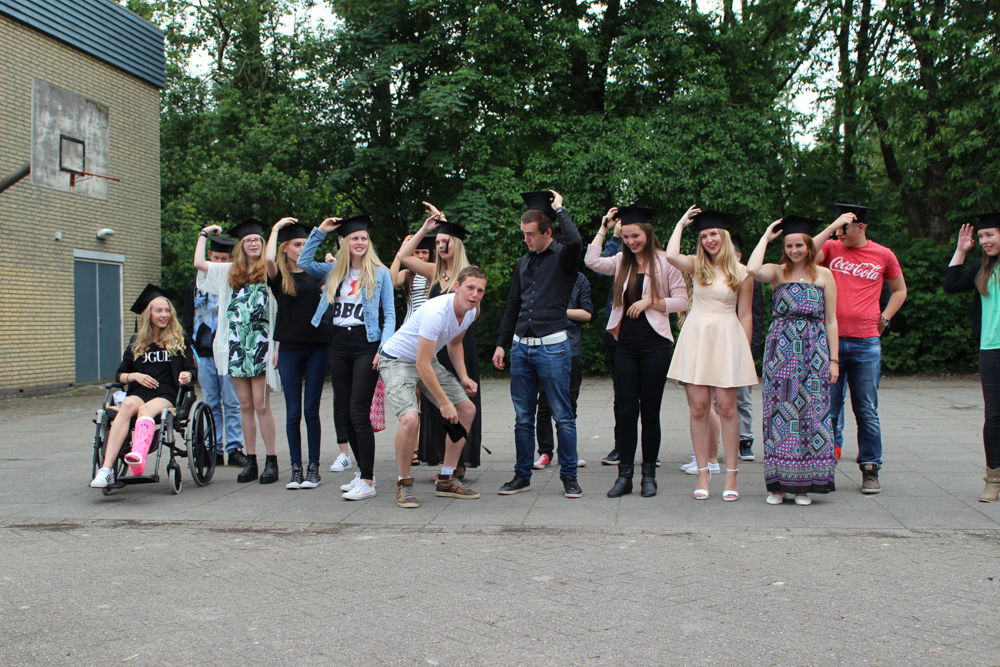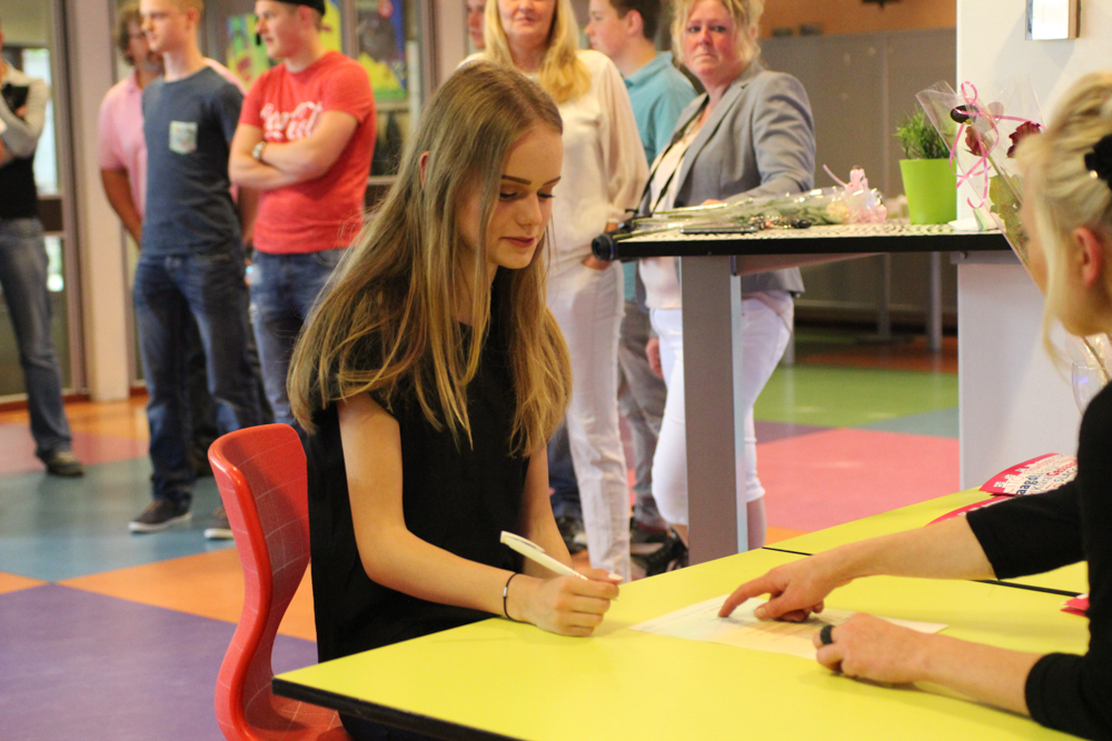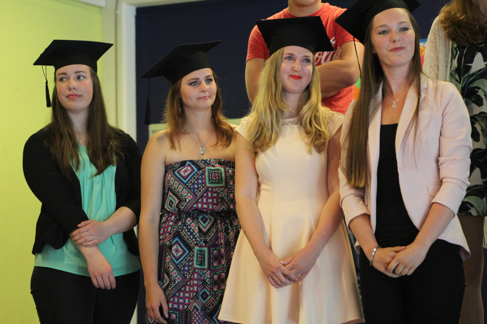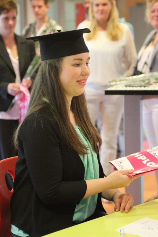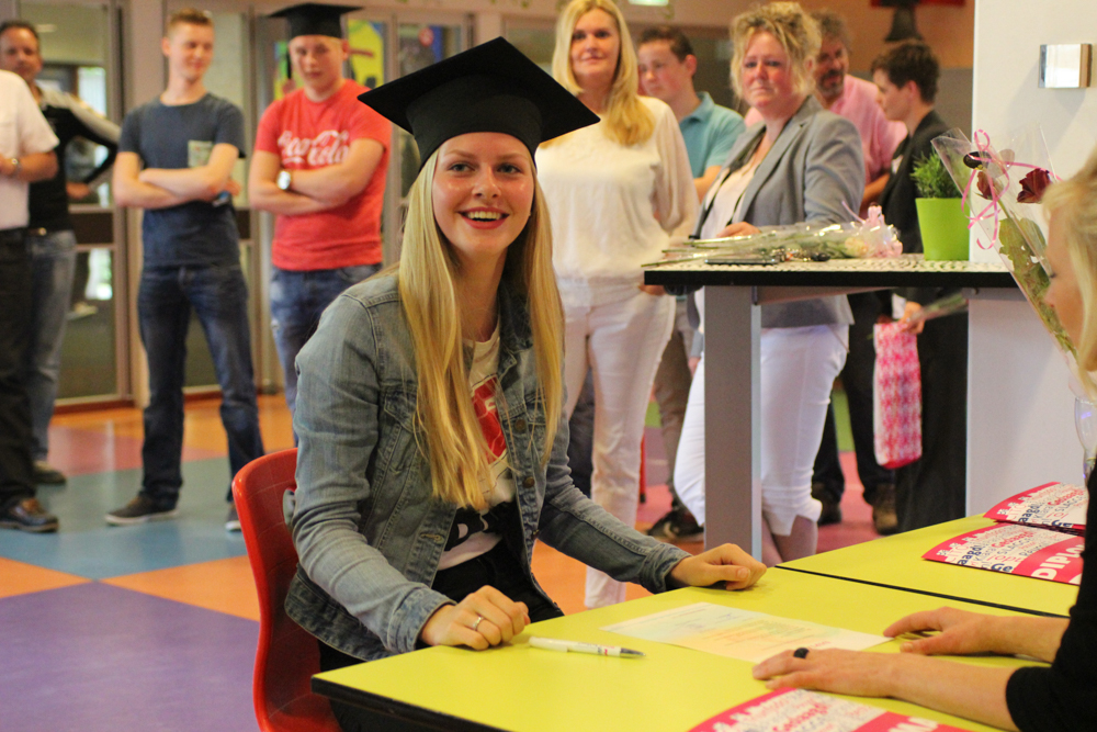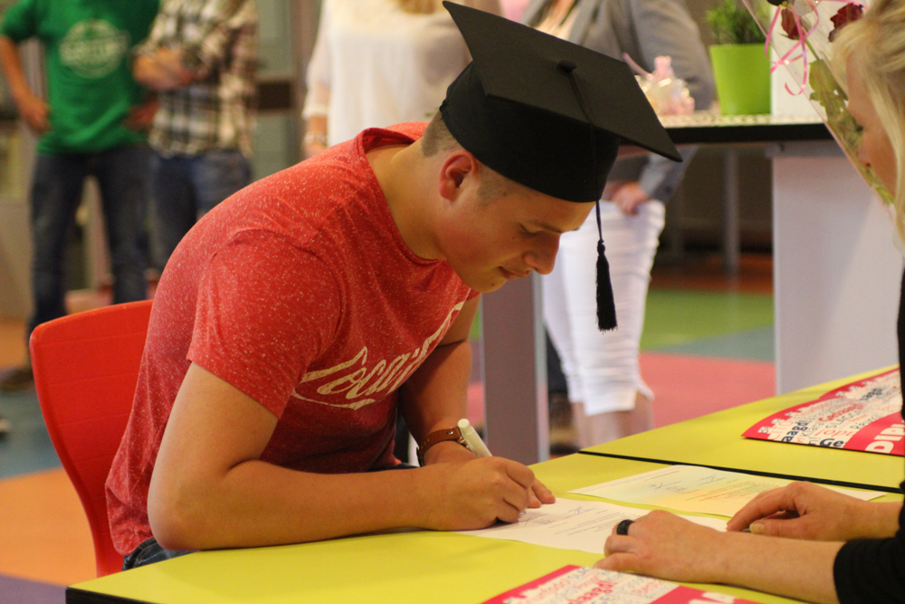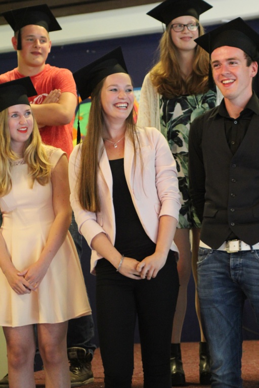 Eerst werd er een welkomstspeech gehouden. De expo (aula) zat vol familie, vrienden, kennissen, en zo meer. Na de speech werden alle leerlingen op het podium geroepen. Over elke leerling werd iets leuks verteld. Zelfs de schoolfoto van het eerste leerjaar werd op een scherm vertoond. Daarna volgde het echte werk; het tekenen van het welverdiende diploma. De geslaagden kregen een roosje mee, evenals een goodiebag.