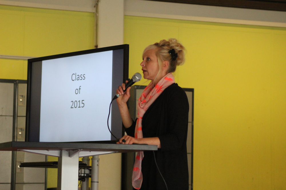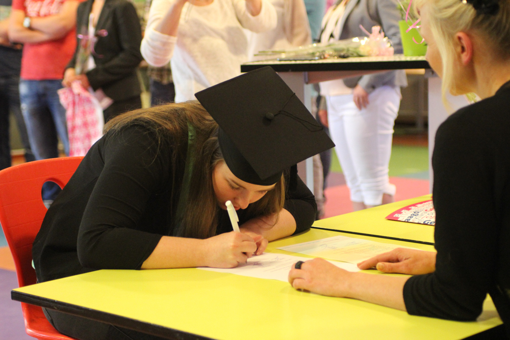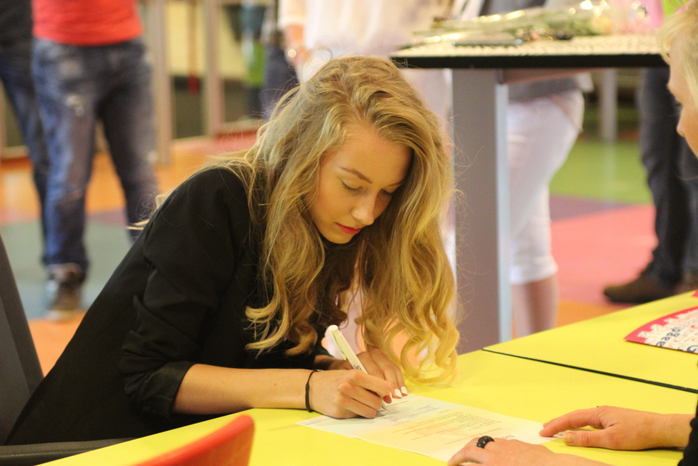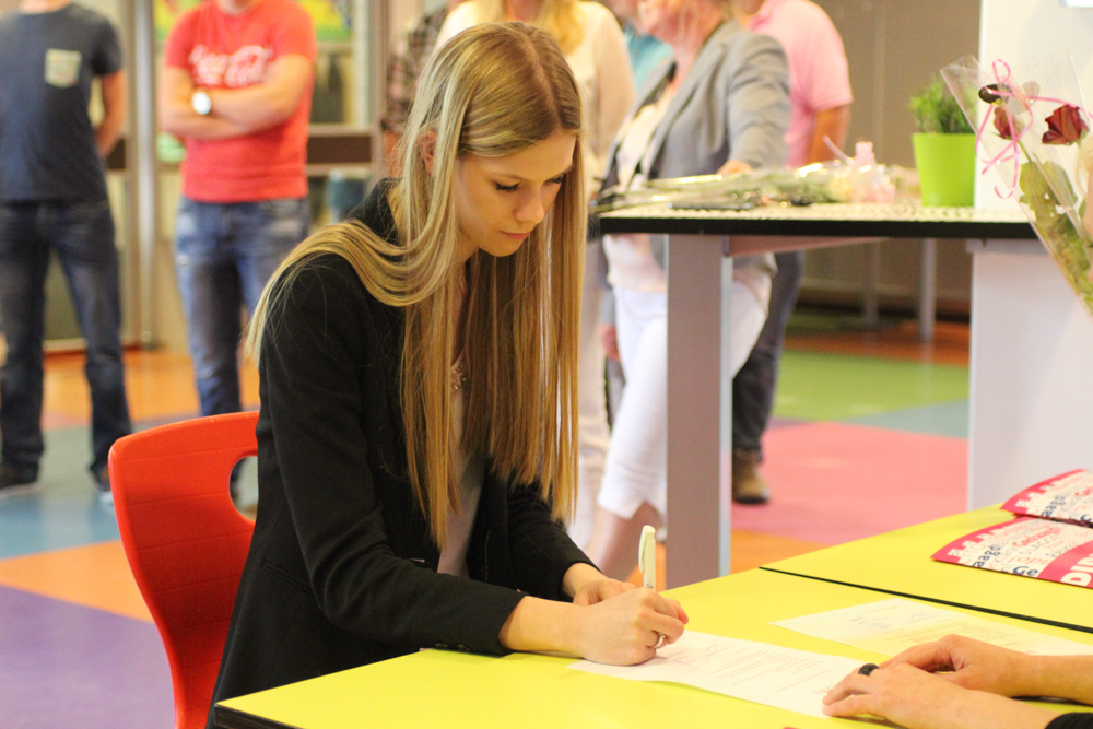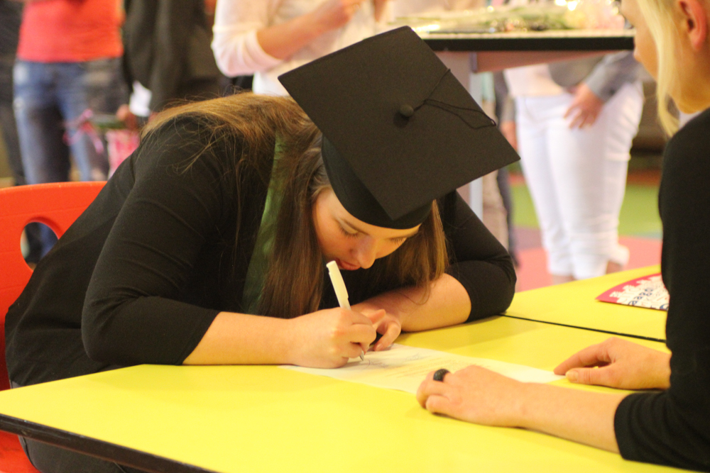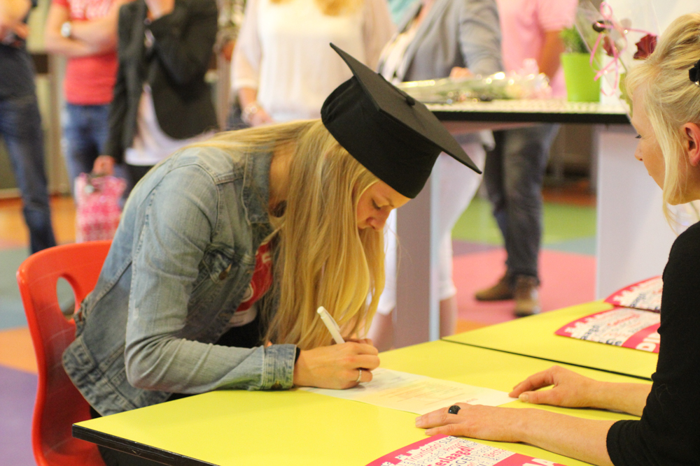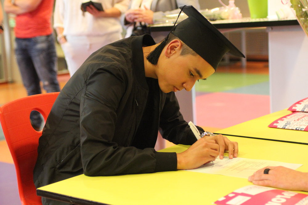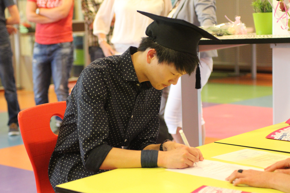 Eerst werd er een welkomstspeech gehouden. De expo (aula) zat vol familie, vrienden, kennissen, en zo meer. Na de speech werden alle leerlingen op het podium geroepen. Over elke leerling werd iets leuks verteld. Zelfs de schoolfoto van het eerste leerjaar werd op een scherm vertoond. Daarna volgde het echte werk; het tekenen van het welverdiende diploma. De geslaagden kregen een roosje mee, evenals een goodiebag.