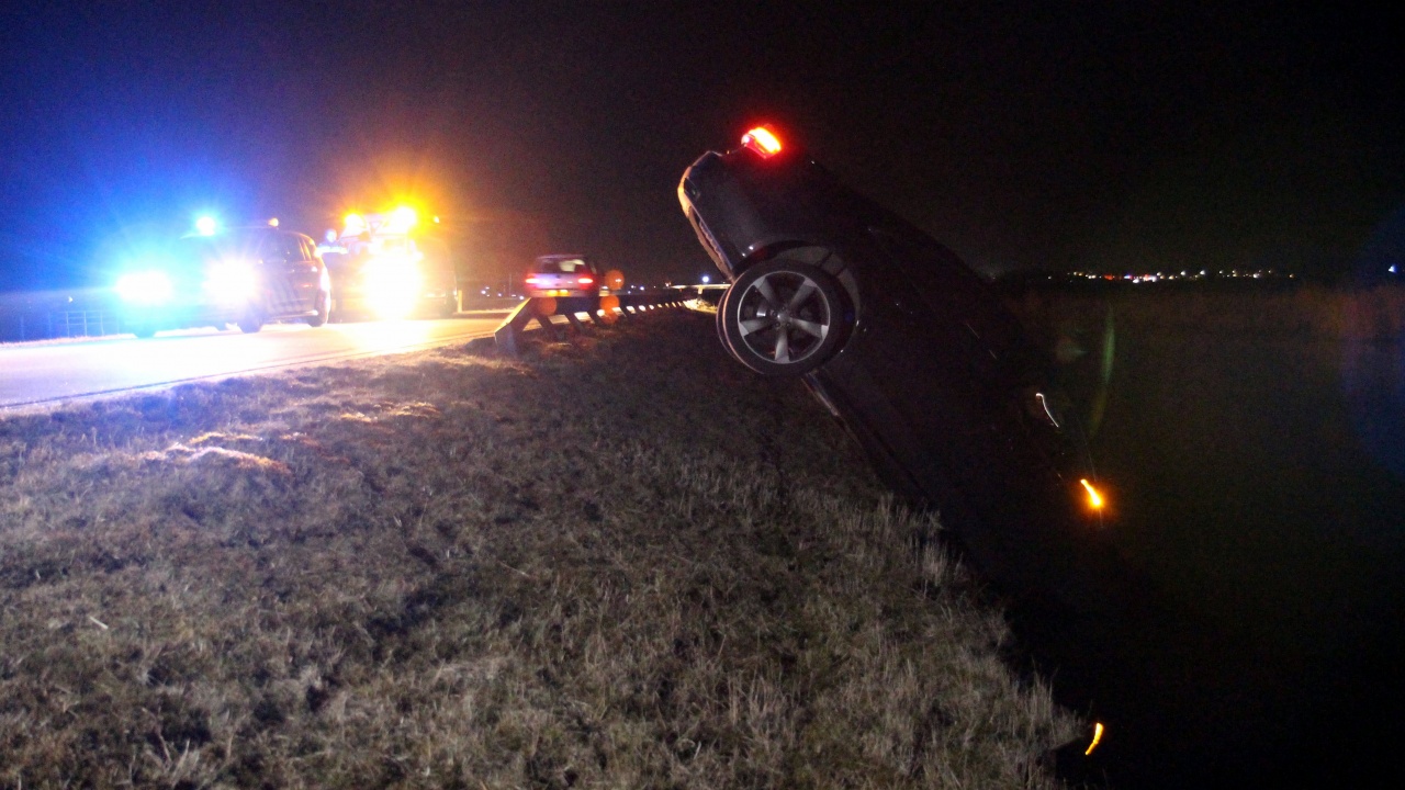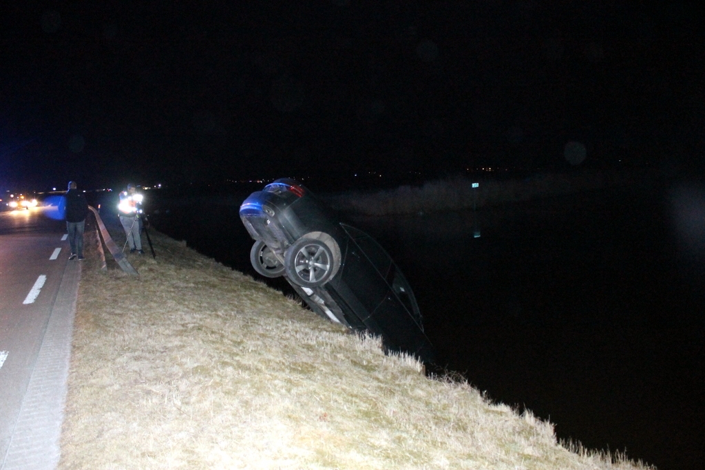 Vermoedelijk door een uitwijkmaneuvre vanwege een ander voertuig, verloor de man de macht over het stuur en kwam de auto rechtop in Trekfeart tot stilstand.