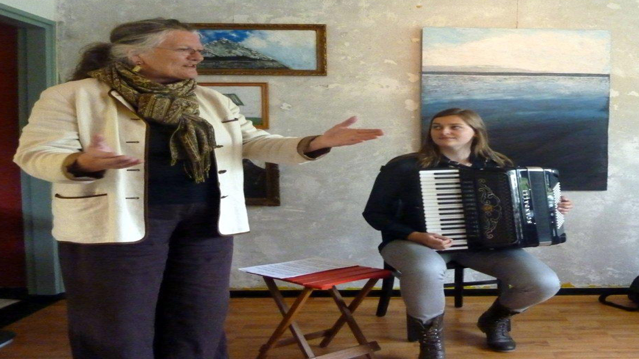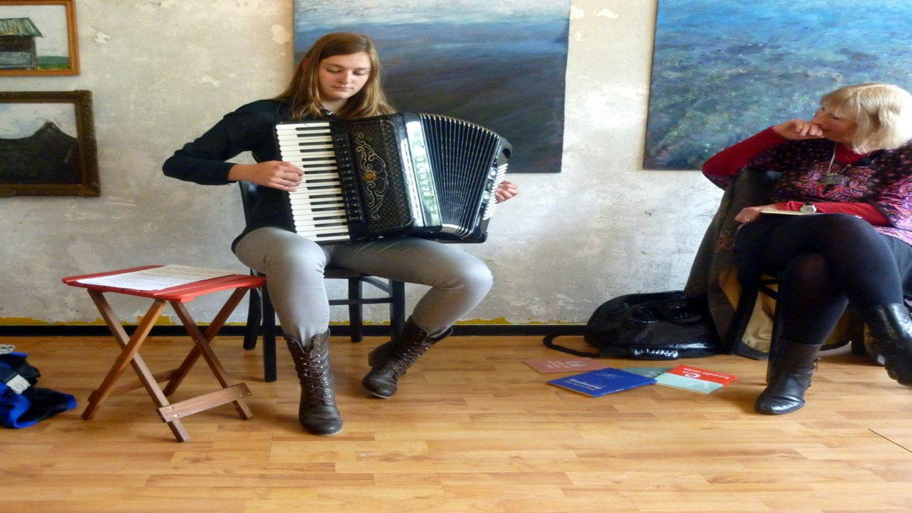 Het publiek genoot zichtbaar van de prachtige poëzie van Marja en werd door de welluidende accordeonklanken van Anna in vervoering gebracht. Een ongedwongen samenzijn in een intieme sfeer omringd door de olieverfschilderijen van Marjan de Boer, die t/m 29 sept. te zien zijn in It Hûs fan de Dichter.