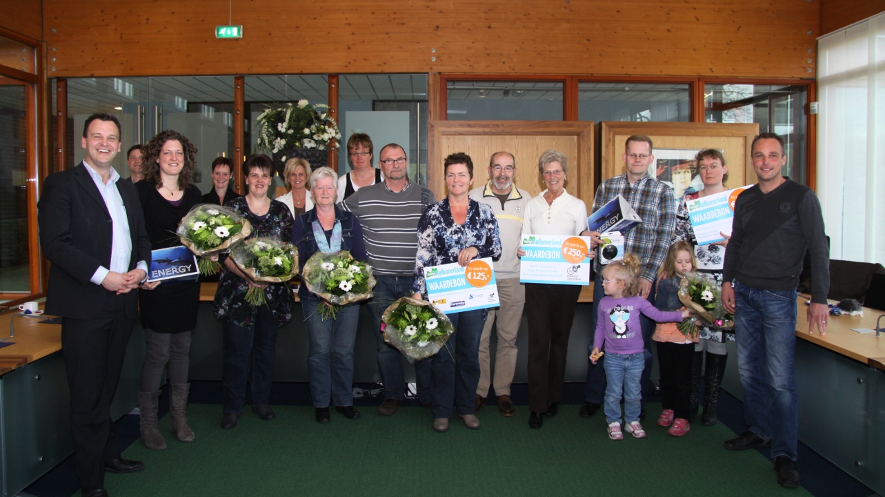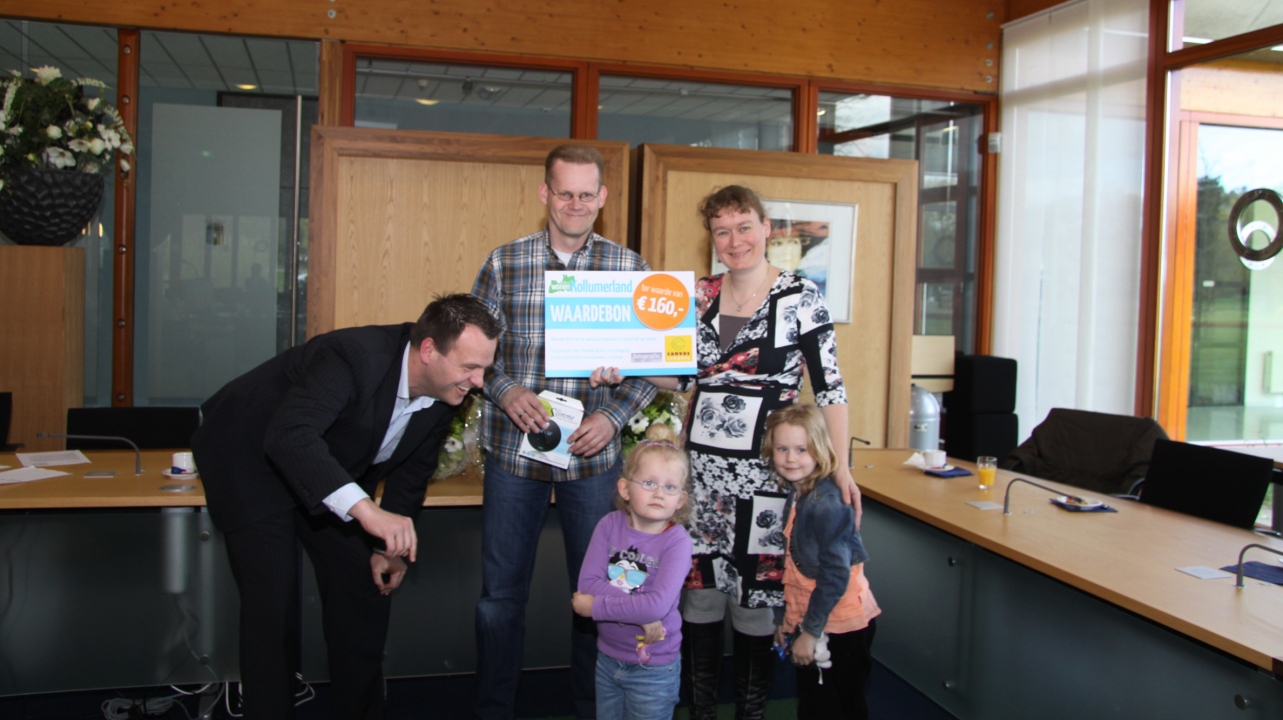 Voorzitter Hilbrand Visser van het Platform Wonen in Kollumerland, de organisator van de verkiezingscampagne energiekste woning, maakte maandagmiddag bekend dat het huis aan de Zwanebloem bijzonder energiezuinig is. De zes twee-onder-een-kapwoningen in deze straat zijn gebouwd in 2007 en zijn zeer duurzaam. De familie Van den Poll heeft ervoor gekozen tijdens de bouw nog meer energiezuinige maatregelen mee te nemen. „Zo heeft onze woning achttien zonnepanelen, een zonneboiler, een warmte terugwinunit en een warmtepomp. We hebben geen gasaansluiting. Verder is ons huis goed geïsoleerd en voorzien van ingebouwde ventilatie”, aldus Van den Poll. „Door dit uitgebreide pakket aan maatregelen is de woning de terechte winnaar in Kollum”, zei Visser tijdens de prijsuitreiking.