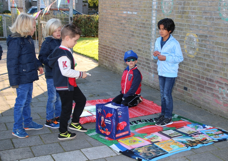 De feestelijke opening van de Boekenweek werd met een dansje geopend door leerlingen van groep 7 en 8. Na de opening werd op het plein een kleedjesmarkt gehouden waarbij boeken gekocht en verkocht werden voor 50 eurocent! Door het mooie weer was het een geslaagde morgen.