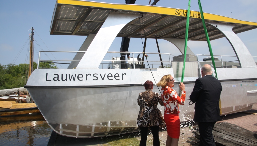Bij de jachthaven in Lauwersoog is afgelopen week de energiezuinige fietsveerpont over het Nieuwe Robbengat officieel in de vaart genomen. De ‘Lauwersveer’ kan twaalf fietsers overbrengen van Het Booze Wijf naar Suyderoogh en vice versa. En dat geheel op zonne-energie. Gedeputeerde Henk Staghouwer onthult de naam van de nieuwe fietsveerpont.