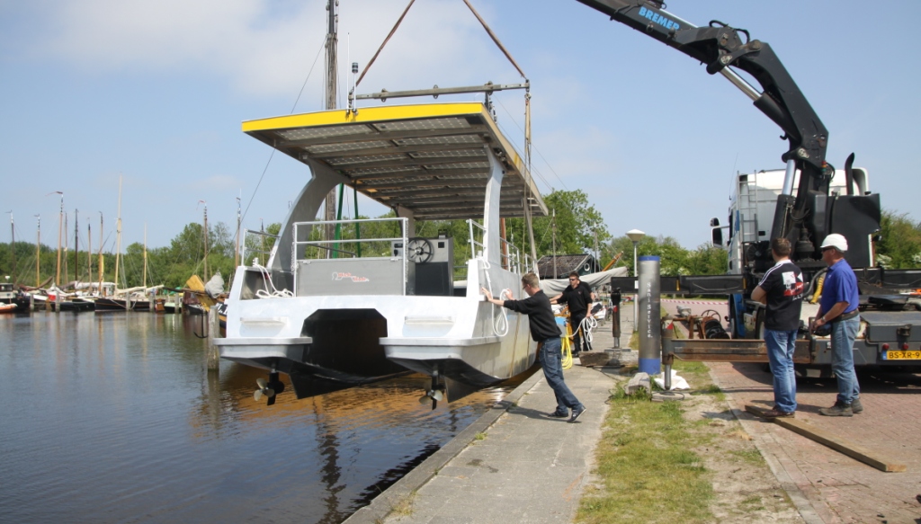 Fietsveerpont op zonne-energie bij Lauwersmeer te water