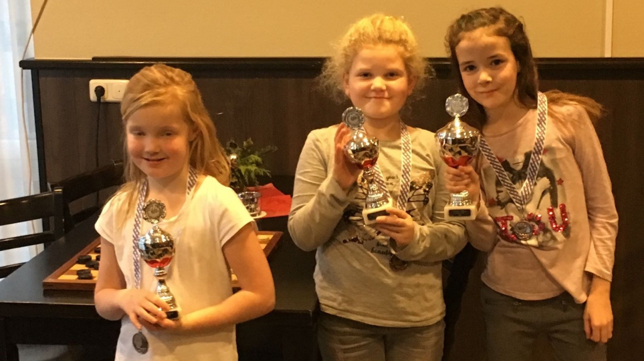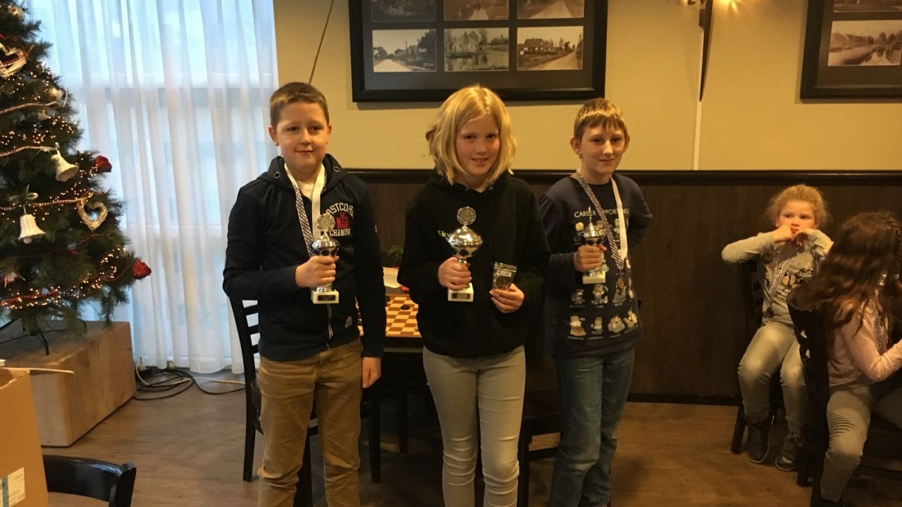 Op foto 2 van links naar rechts de winnaars bij de pupillen: Jacob Noordhuis (2e), Yneke Goerres (1e), Cornelis Jan Kappen (3e)