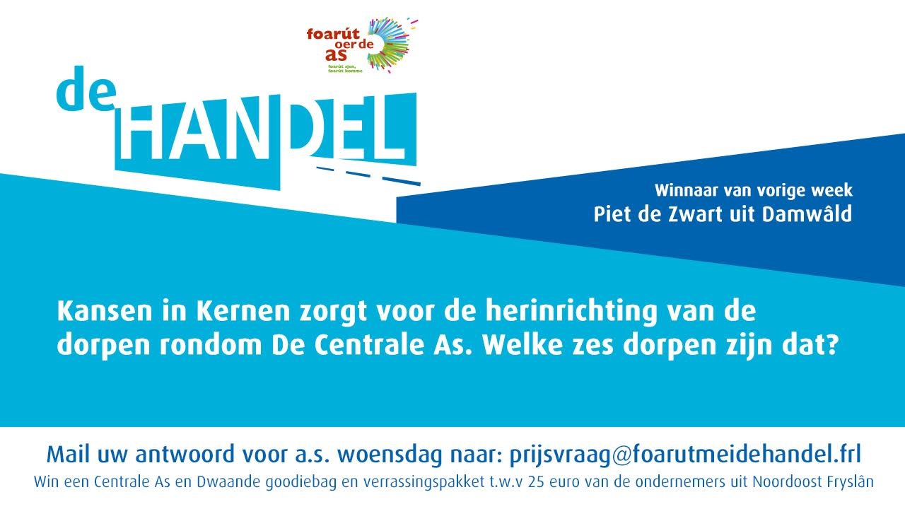 Op zaterdag 17 september is het evenement Foarút oer de As mei de Handel. De komende weken is er wekelijks een leuke prijsvraag. Met te winnen een Dwaande en Centrale As goodiebag en cheque t.w.v. 25 euro van een van de deelnemers aan dit evenement. ‘Van knooppunt Feanwâlden tot het knooppunt Sumar een lint van maar liefst 9 kilometer met bedrijfspromoties, braderie, rommelmarkt, demonstraties, alternatieve voertuigen, muziek en theater en natuurlijk kinderactiviteiten’. De website www.foarutmeidehandel.frl staat open voor aanmeldingen.