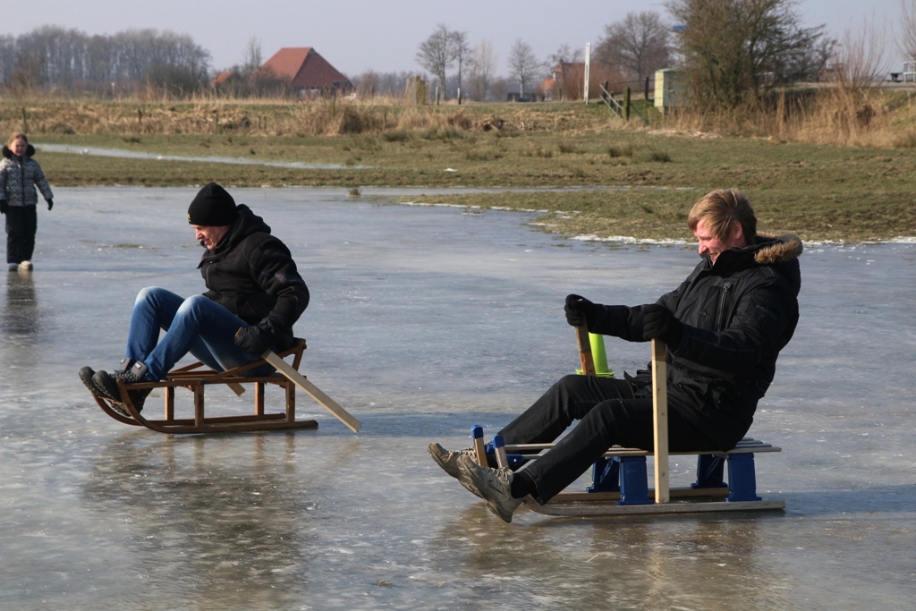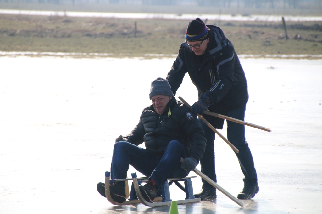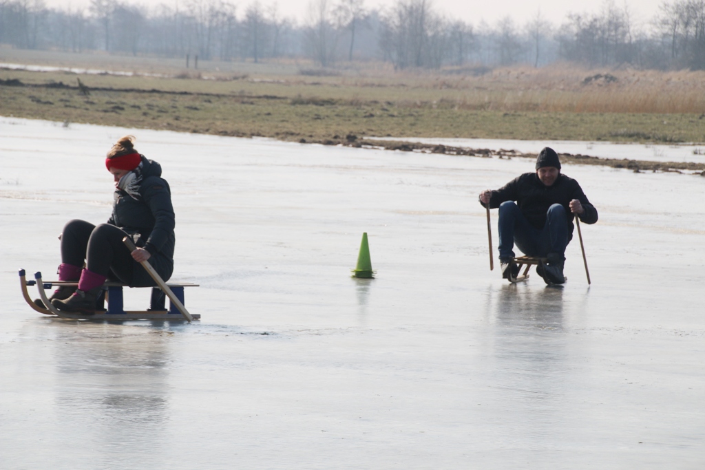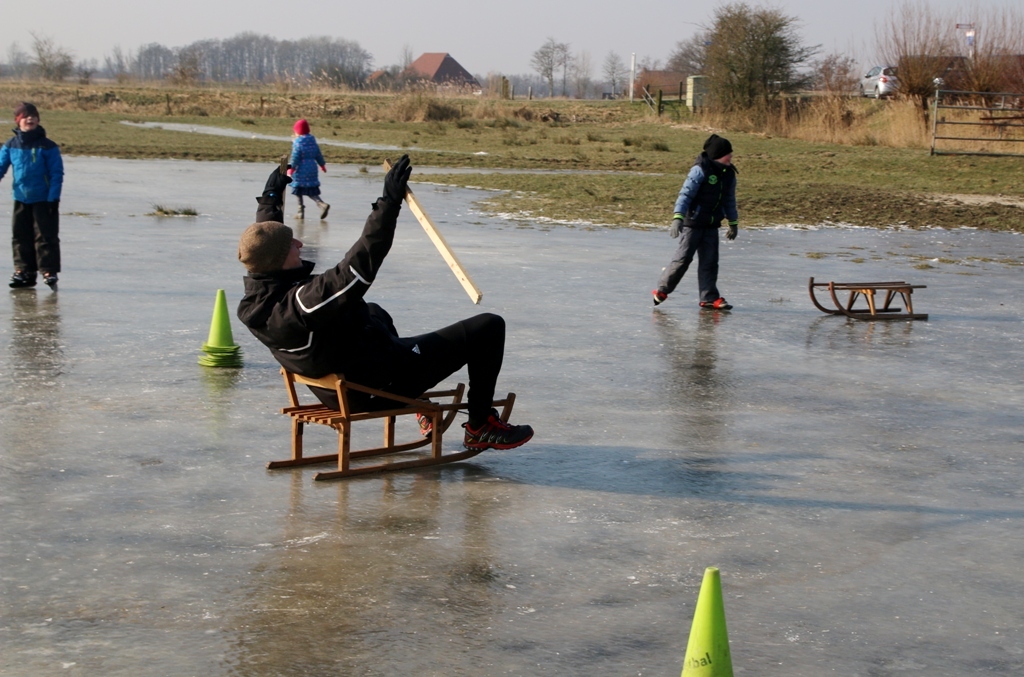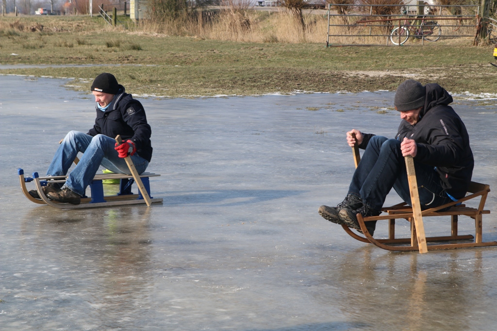 Zaterdagmiddag 3 maart werd er priksleeën gehouden bij de dolle in de Triemen op een ondergelopen stuk land door dames / Senioren van Friese Boys en de Duitse gasten van Douwe Dam.