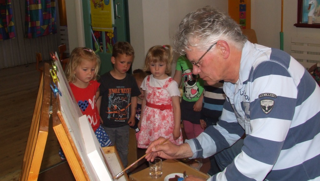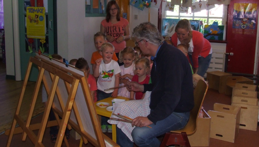 Maar niet alleen de peuters hebben kunst gemaakt, ook zijn er verscheidene ouders die hun eigengemaakte kunst meegegeven hebben naar de speelzaal zodat het door iedereen bewonderd kon worden. Op alle groepen werd deze week voorgelezen door de Kollumer kunstschilder Rein Halbersma.De kinderen genoten van het verhaaltje van Tomke en weten nu dat je niet in leesboeken mag kleuren en tekenen, maar natuurlijk wel in je eigen kleurboek.