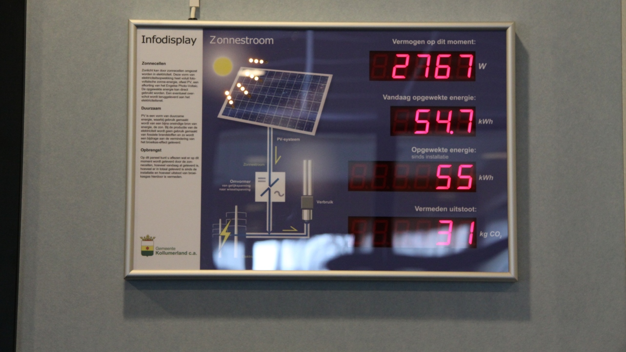 Een deel van de stroom die de gemeente Kollumerland c.a. voor haar kantoor gebruikt, wordt voortaan opgewekt met zonnepanelen. In totaal zijn er 88 pv-panelen geplaatst op drie gemeentelijke gebouwen in Kollum. De display in de hal van het gemeentehuis toont de hoeveelheid energie die een deel van de panelen dagelijks produceert. De investering in duurzame energie past in het streven van Kollumerland om in 2020 klimaatneutraal te zijn.