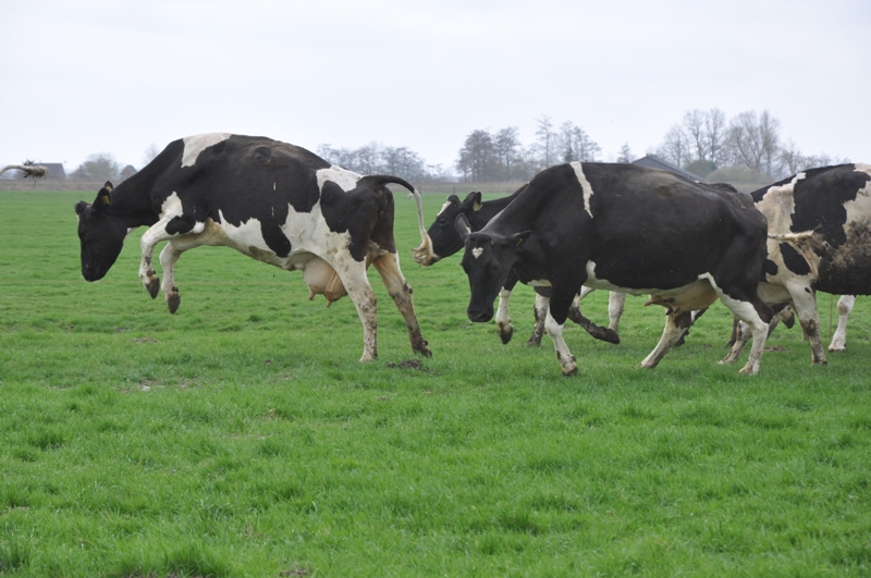 Donderdagmiddag was het groot feest in het weiland van het boerenbedrijf J. van Lune aan het Oost bij Buitenpost. Na de hele winterperiode in de stal te hebben vertoeft mochten de koeien weer het weiland in. Voor de koeien een groot feest. Nadat de deur was geopend door Rienk van Lune kwamen de herkauwers al springend en dansend naar buiten.
