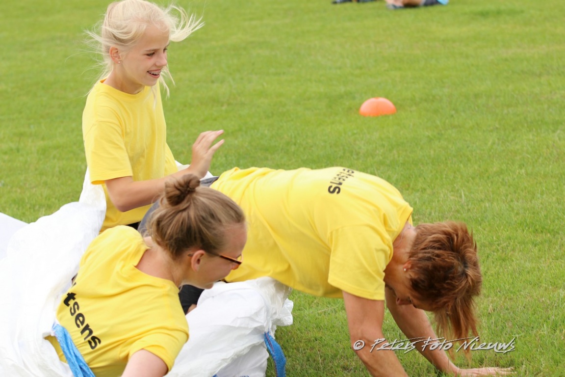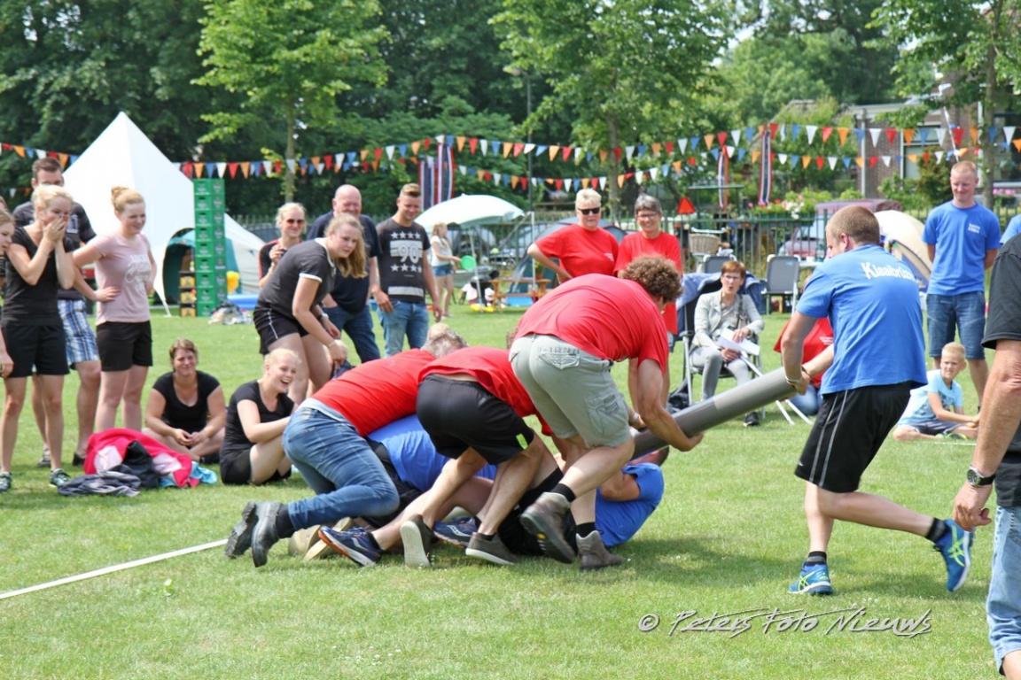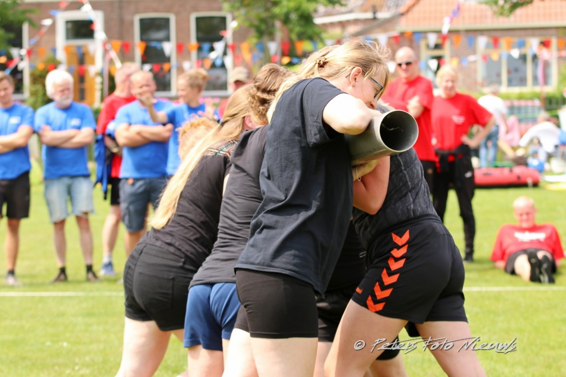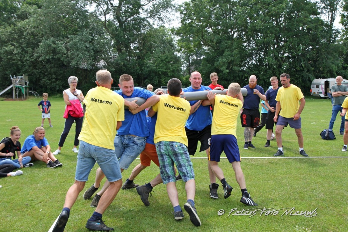 Inmiddels was het tijd geworden om een gezamenlijke maaltijd te nuttigen die door Slagerij Weidenaar uit Dokkum was verzorgd. Bami, nasi gebakken aardappelen, diverse soorten vlees en een groente mix stonden te wachten om geconsumeerd te worden. Nadat een ieder vol en tevreden was, werd het weer tijd om de strijd voort te zetten. Als eerste na de lunch was er een nepboomstam in de vorm van een pvc buis welke door twee teams tegen elkaar in te laten duwen over de streep moesten worden gebracht. Het lijkt zo simpel maar dat viel aardig tegen, een ware sloopstrijd. Met vermoeide spieren naar het volgende onderdeel, het zakgooien. Een jute zak gevuld met zand moest over een gespannen draad gegooid worden. Startende op ongeveer twee meter werd er doorgestreden tot de draad bijna op het hoogste punt zat. Dit was om en nabij vierenhalve meter.
