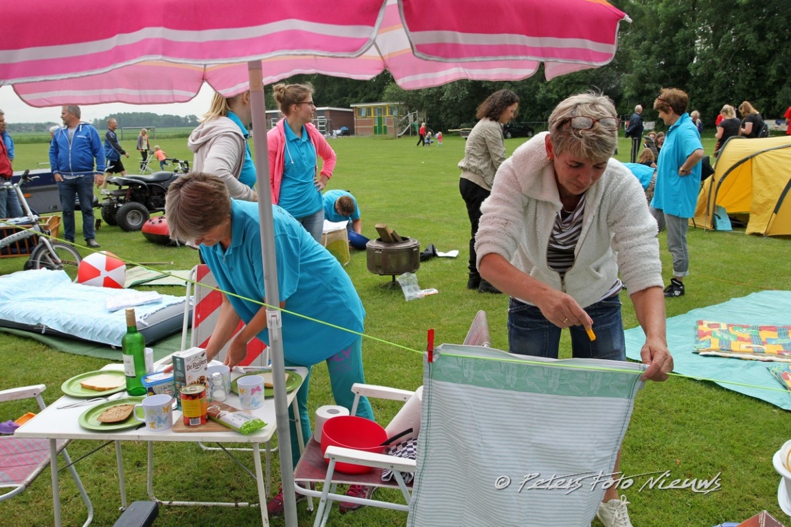 Na een gezamenlijk kop koffie traden de verschillende teams aan op het strijdtoneel. Er werd gestart met hoefijzer gooien, daarna een menselijke kruiwagen race en vervolgens kregen alle teams een extra opdracht. Deze bestond uit het inrichten van een heuse kampeerplek. Een ieder moest thuis dingen verzamelen welke op een camping gebruikt wordt. Deze werden gebruikt om daadwerkelijk een camping achtige plek in te richten.