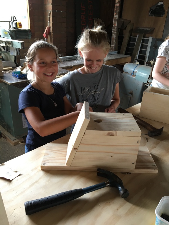 Nadat de kinderen in de klas van alles hadden geleerd gingen ze ook nog even de praktijk in door middel van een bedrijfsbezoek in de werkplaats van het bouwbedrijf. Daar hebben ze bouwtekeningen en gereedschap bekeken. Ook mochten alle kinderen een vogelhuisje maken. Zelf timmeren en gaten boren is wel heel erg leuk!