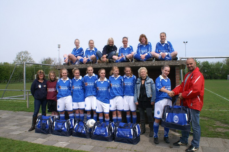 Staand v.l.n.r. Aafke Aukje de Vries, Gerda Bloem, Debbie van Elden, Anna-Wil de Vries, Janneke Postma, Aukje Dietje Dijkstra, Esther Haak, Judith v.d. Veen en het sponsorechtpaar Van der Wal die hun dochter Ilse de eerste voetbaltas aanbiedt.