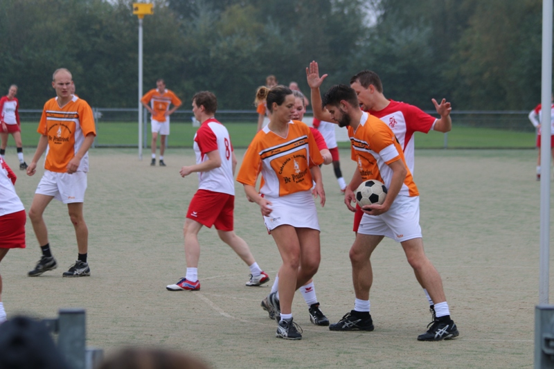 De opstelling was als volgt, in de aanval begonnen: Uulco Hoekstra, Jorn van der Weg, Marieke van Straten en Folkje Tjalsma. De verdediging bestond uit: Wim Oostra, Annejan Miedema, Wilma Grijpma en Silva van der Laan. Jorn van der weg opende in de eerste minuut de wedstrijd met een mooie afstand goal, maar al snel wist Rood/Wit hier antwoord op te geven, 1-1. Al vrij snel was duidelijk dat de eerste helft telkens gelijk op liep. Het lukte niet om een paar doelpunten voor te komen, want Rood/Wit wist dit gelijk weer recht te zetten. De verdediging stond goed te verdedigen en uit het aanvalsvak kwamen mooie acties en die resulteerden tot mooie doelpunten van onder andere Wim Oostra, Wilma Grijpma, Annejan Miedema, Uulco Hoekstra en Silva van der Laan. Ze gingen met 7-7 gelijkstand de rust in.