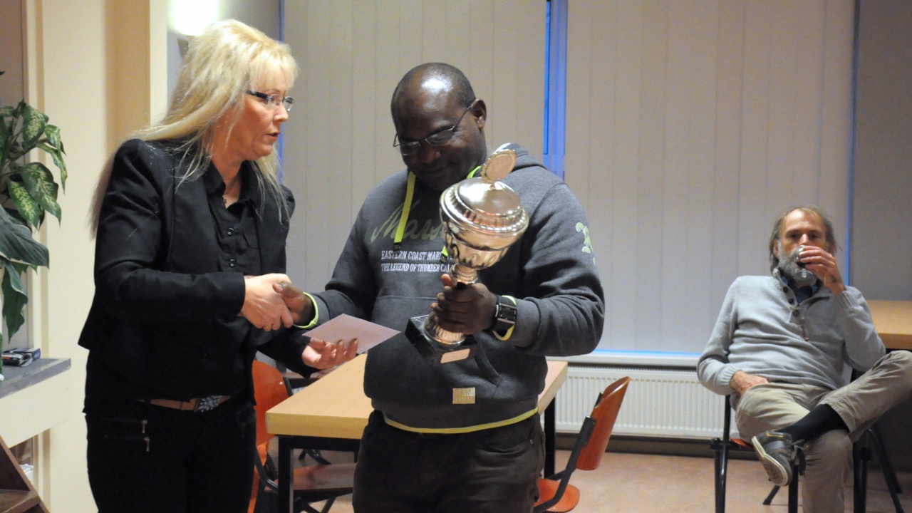 Over naar categorie B: uit Lioessens komt Durk Douma, deze krasse tachtiger pakte toch maar mooi even de derde prijs, 8 uit 7, een fraaie prestatie, de tweede prijs ging naar Hans van Dijk uit Feanwâlden, ook 8 uit 7, daar was Hans best wel content mee, de gouden plak werd een prooi voor Don Khedoe uit Lelystad, 9 uit 7 is bepaald niet misselijk en dus was Don de terechte winnaar van de B categorie.
