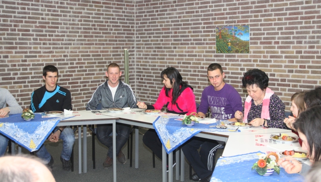 De groep werd verwelkomt door Ds.E.J.M.Peersmann en de werkgroep protestantse gemeente van Kollum, waar een lekkere warme stamppot boerenkool voor hun klaar stond. De jongeren hebben een leeftijd van ongeveer 20-24 jaar bestaat uit 7 dames en 9 heren. Deze groep jongeren komen naar Kollum om in contact te komen met jongeren uit Kollum.
