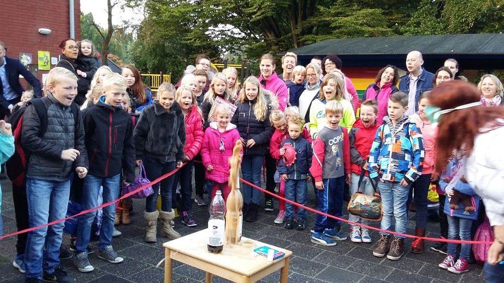 De leerlingen op OBS dr Theun de Vriesskoalle reageerden vanochtend blij verrast toen een team van “wetenschappers” de beroemde cola-fontein kwam demonstreren. Altijd een spannende truc! Met de cola-fontein gaven de wetenschappers de aftrap voor een dag vol proefjes in de klas. De basisschool in Feanwâlden viert op deze wijze de start van de Kinderboekenweek Raar maar Waar die dit jaar in het teken staat van wetenschap.
