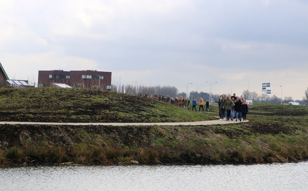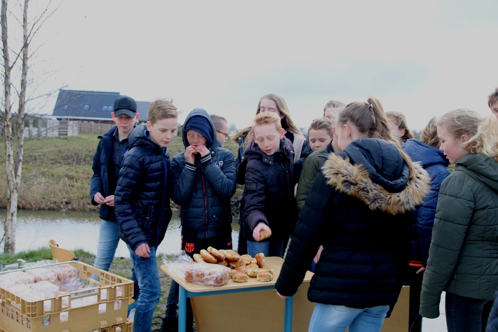 Hoe verliep het? Om 11 uur brak de zon door het wolkendek en met een kleine vertraging begonnen de eerste klassen aan hun wandeltocht. Zonder rugzak en zonder telefoon. De leerlingen waren zelfs enigszins uitgelaten, en benieuwd naar dat wat zou komen. Rond 13.15 uur gingen de laatste groepen op weg en de zon scheen nog steeds. Met een voldaan gevoel de school terug inlopend volgde een verassing: een podium vol met 32 gevulde dozen voor de voedselbank.