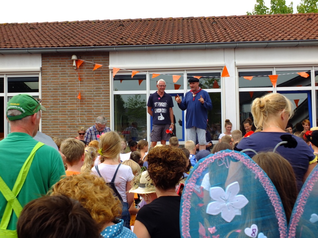 Meester houdt van de natuur en van de sport. Dat was duidelijk zichtbaar. Veel kinderen, meesters en juffen waren versierd met bloemen, planten en vogeltjes. Ook Jan de tuinman was erbij en natuurlijk ontbraken de blauw gele kleuren van volleybal vereniging DOS niet. De lessen op school stonden dan ook in het teken van natuur en sport. De jongste kinderen hebben het Tomkepaad gelopen, de oudere kinderen konden braakballen pluizen, natuurbingo spelen, de wereld naast en om de sloot ontdekken, sporten met medewerking van High Five en nog veel meer.