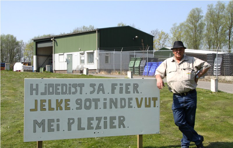 Dinsdagmorgen is hij eerst nog even naar Vermolen in Leek geweest om borden op te halen, daarna schilderde hij nog zijn laatste bankje en in de middag was hij aanwezig bij de Milieustraat aan Trekweg te Kollum.