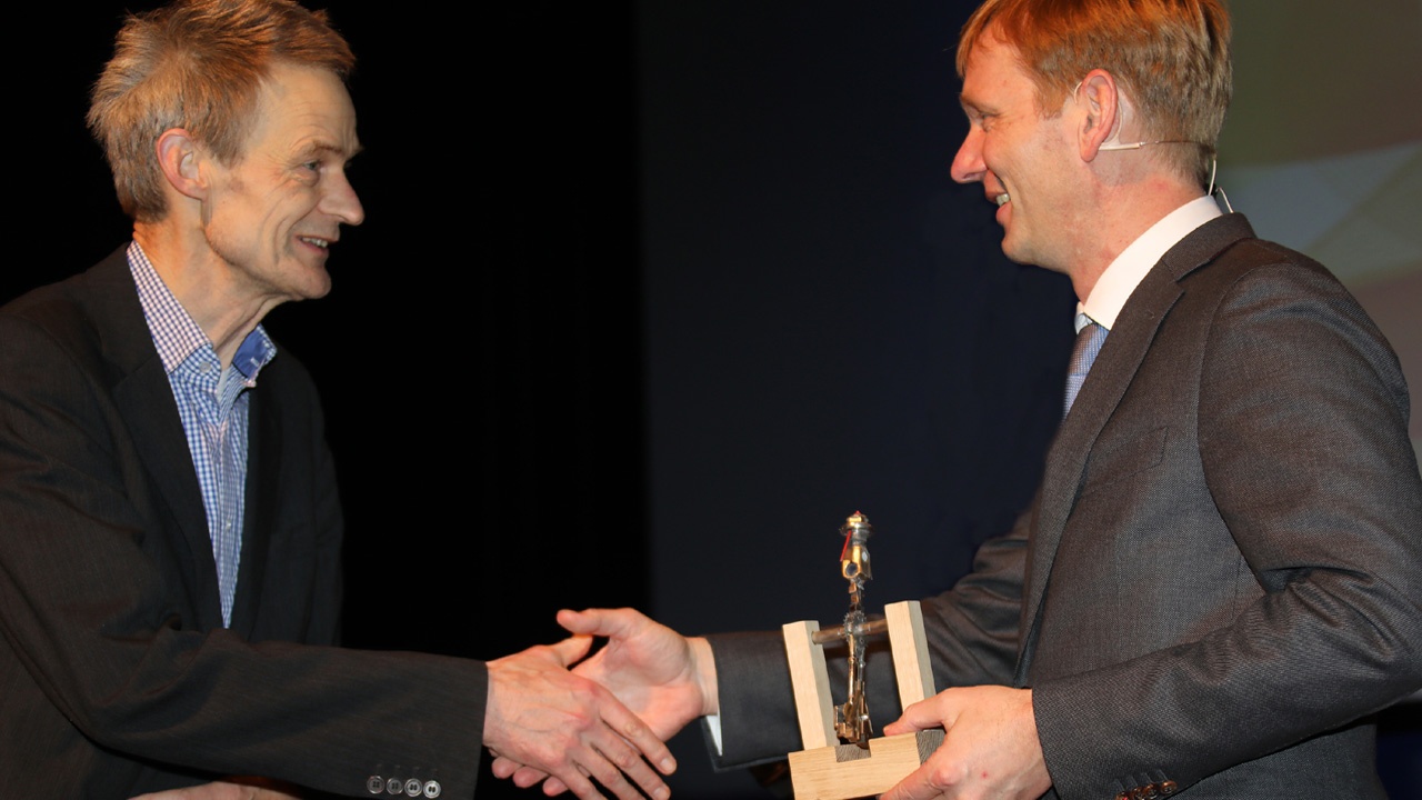 Michiel Langman neemt de aan zijn vader – Harrie Langman – postuum toegekende NoordKrachtig prijs in ontvangst van voorzitter Sieger Dijkstra.