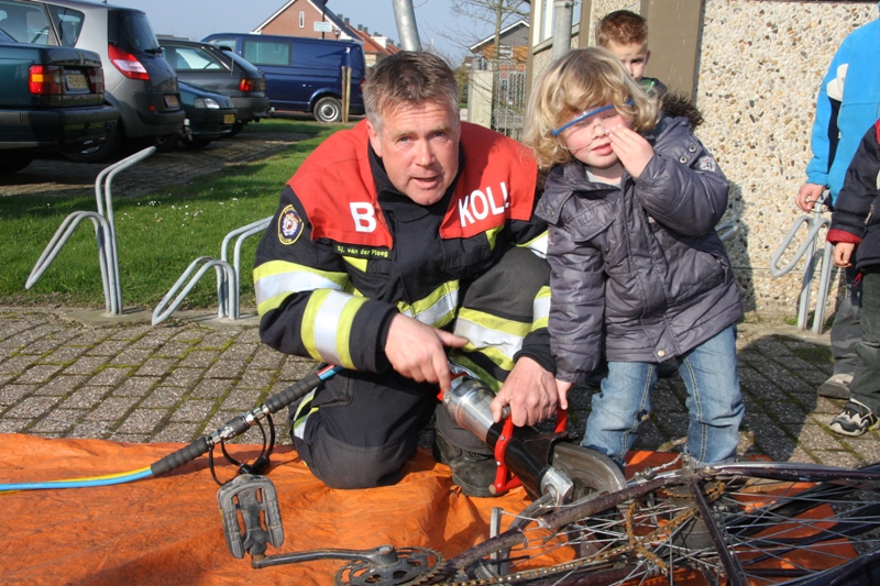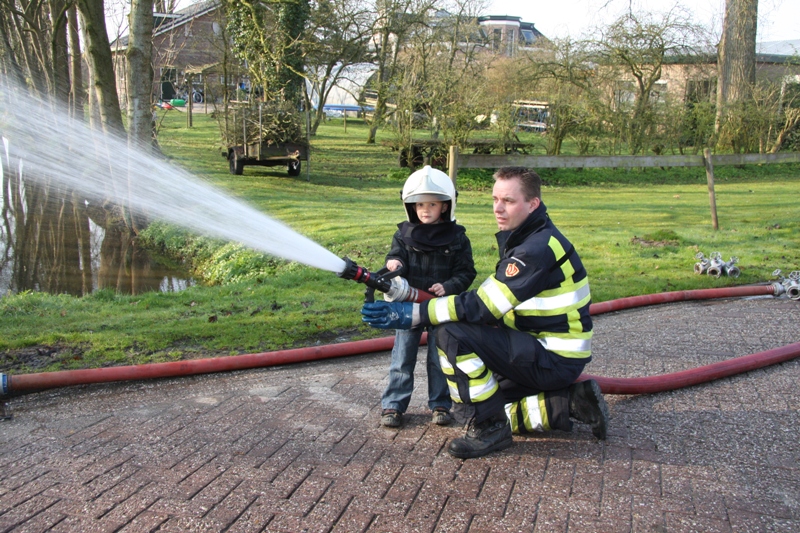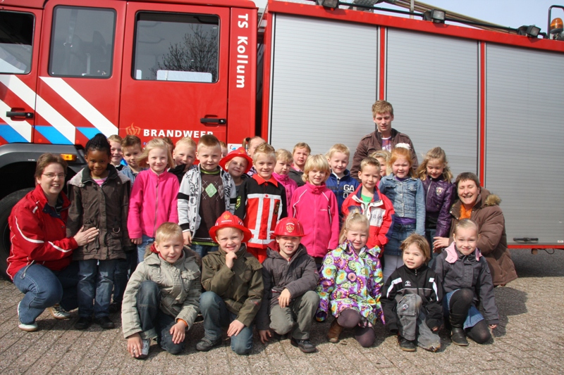Maar met een thema als de brandweer kon een bezoek aan de brandweer niet uitblijven. Zo vertrokken de kinderen opgewekt van school. Bij de brandweerkazerne aan gekomen stonden de brandweermannen ze al op te wachten. De hele groep ging naar de Kantine, daar kregen de kinderen even uitleg van Siebe de Jong wat er alzo gebeurt bij de brandweer. De kinderen mochten een kijkje nemen in de brandweer auto, men mocht een fiets door knippen,en spuiten met een echte brandweer spuit.