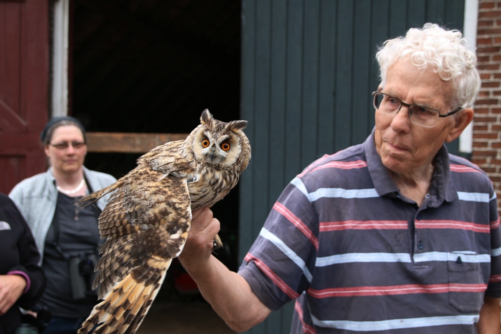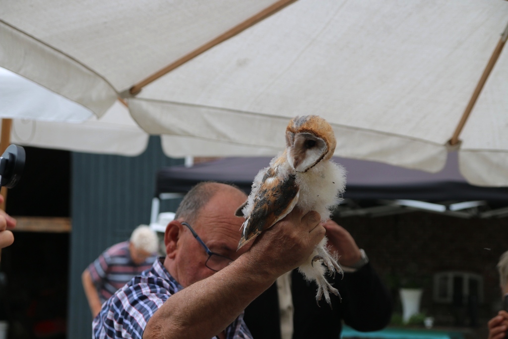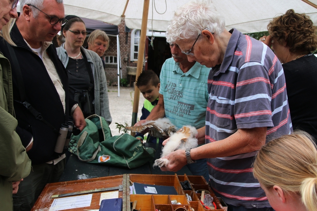 Enkele weken geleden hadden de kinderen van Betty Kooistra, gids van de Klyster, een gastles gehad over de Kerkuil en hadden ze braakballen uitgeplozen. Nu zagen de kinderen de uilskuikentjes in het echt! Koos Huizenga haalde de uiltjes naar beneden en Johan de Jong zorgde voor het ringen,wegen en meten van de uiltjes. En wie graag wou , mocht een pluizig, slapend uiltje vasthouden! Het was prachtig!