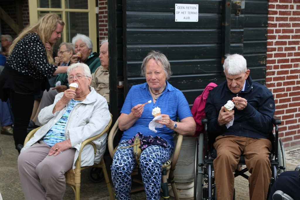 Ook bij de alpaca’s mochten ze binnen de hekken. Het blijkt wel dat er veel verscheidenheid aan dieren bij is gekomen voor jong, maar zeker ook voor ouderen een prachtige gelegenheid is om zeker vaker naar toe te komen. Na het hertenkamp ging het richting Pruttelpot om van een heerlijk ijsje te genieten. Deze tocht was een groot succes waar iedereen erg van genoot en voor herhaling vatbaar.