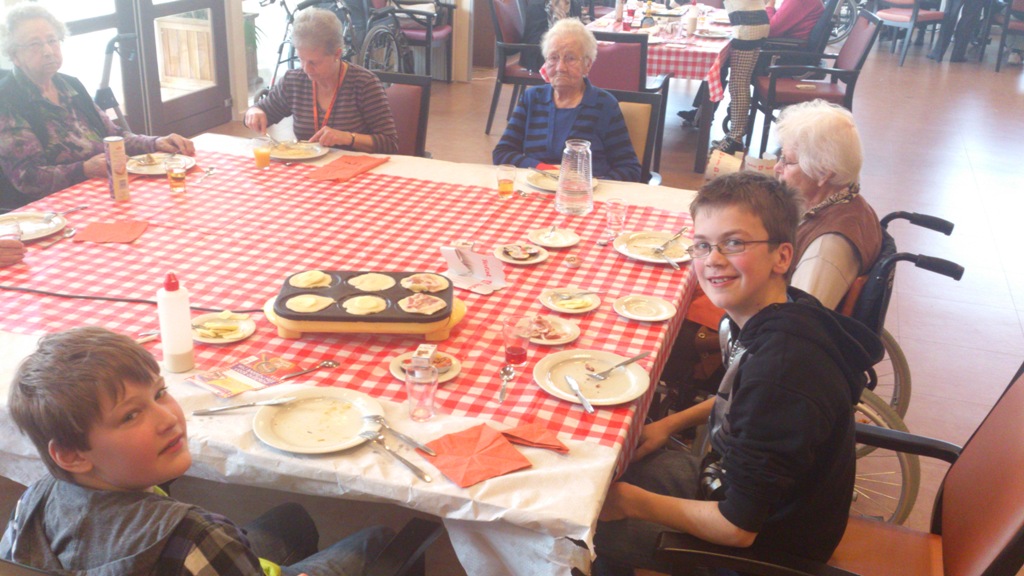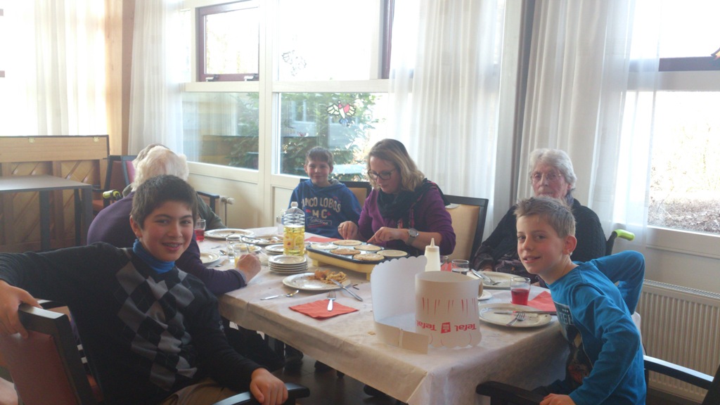 Na ongeveer een half uurtje kennis maken en gezellig praten met elkaar, begonnen de eerste kinderen met het bakken van de pannenkoeken. Dit bakken gebeurde op de tafels waar de lekkernijen ook werden gegeten. Ook de bewoners mochten mee helpen bakken als ze dit wilden. De kinderen hadden opdracht gekregen de bewoners hierbij goed te helpen en dat deed iedereen erg goed.
