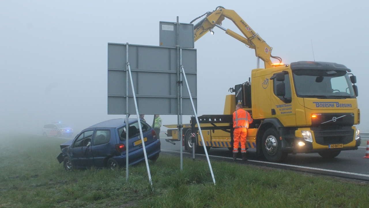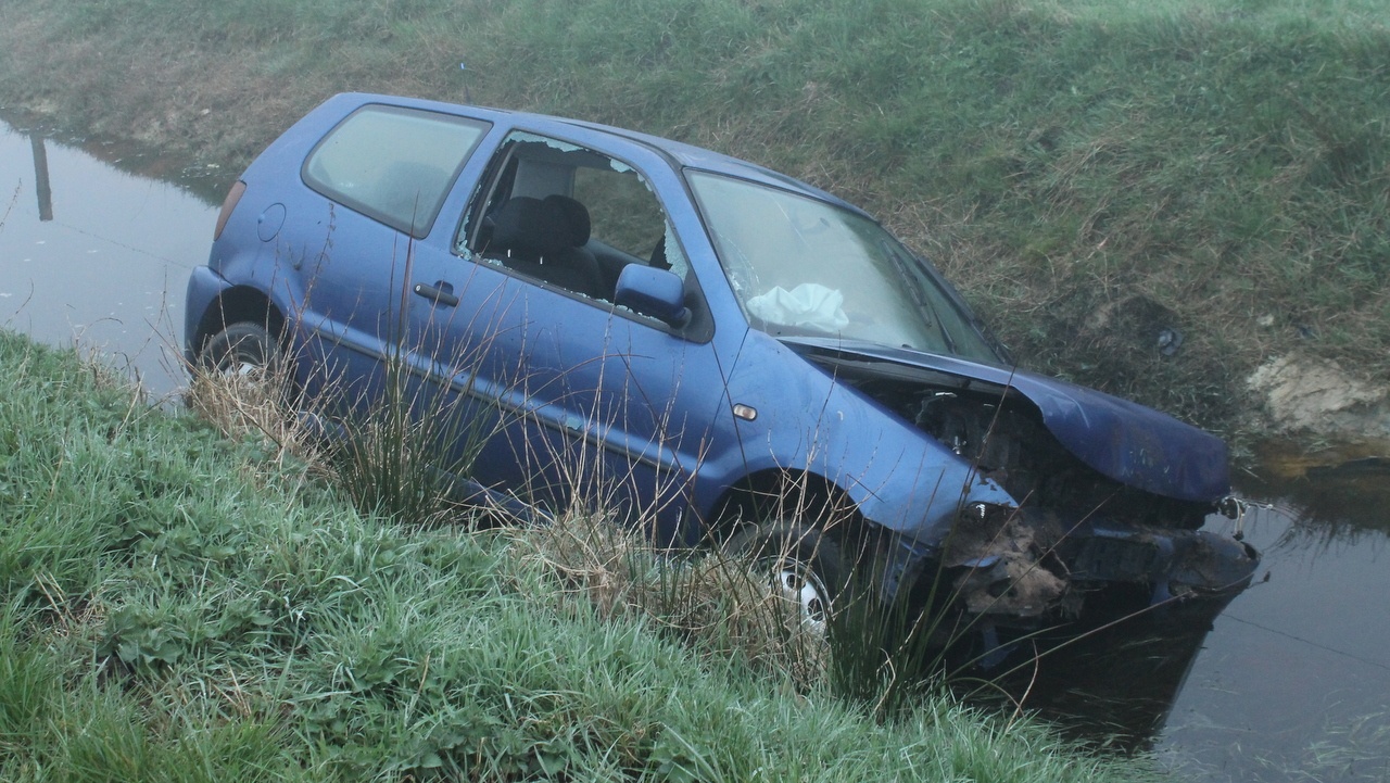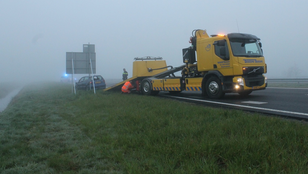 Tijdens de dichte ochtendmist is op de Haadwei – N356 (Sintrale As) donderdagmorgen een personenauto in de sloot terecht gekomen.