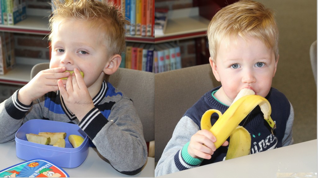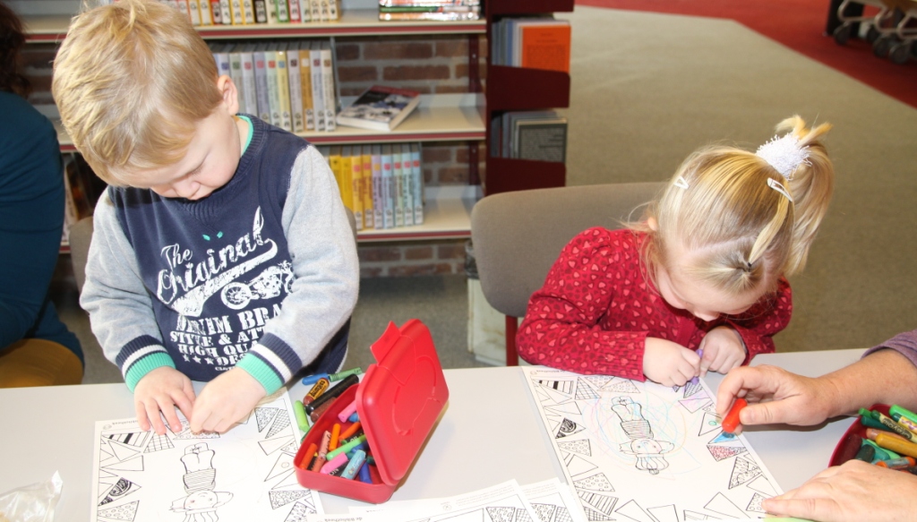 Terwijl de ouders koffie dronken en informatie ontvingen over de bibliotheek aten de peuters hun fruit en dronken wat. Wie klaar was ging een kleurplaat kleuren van Dorus.