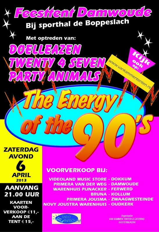 Zaterdagavond is er een groots feest onder de naam The Energy of the 90’s in de feesttent bij De Boppeslach in Damwâld. Het evenement wordt georganiseerd in nauwe samenwerking met tentenverhuurbedrijf Van Kammen uit Oosternijkerk. Optredens zijn er onder meer van acts als Twenty4Seven, de Party Animals en de Doelleazen. Jelle B en Mink zijn met de Doelleazen achter de schermen druk bezig met een bijzonder project ter gelegenheid van de terugkeer. Natuurlijk zijn ook de dj’s van de Energy Discoshow zaterdagavond paraat om de hits van toen te draaien.