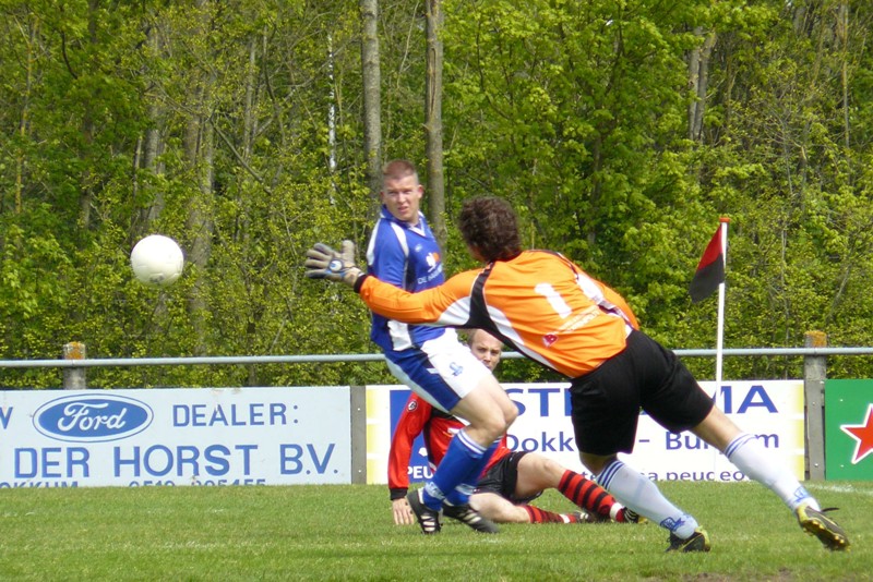 Na vijf minuten had een foutje van Ronnes Bloembergen van Buitenpost het team fataal kunnen worden. Tjalling van der Meulen van Broekster Boys schoot van afstand direct op de goal van Buitenpost, maar keeper Kobus wist het leer te stoppen. Een minuut later leek Dirk Rinse Pilat van VV Buitenpost in buitenspelpositie te staan, maar Pilat mocht doorgaan en scoorde via de handen van keeper Karim Oortgijsen ( 0-1 ).Na een kwartier schoot Stephan Overkempe van Broekster Boys over de lege goal. Halverwege de eerste helft kreeg Dirk Rinse Pilat van Buitenpost de bal in buitenspelpositie. Grensrechter Buwalda vlagde niet, omdat Pilat de bal op eigen helft de bal zou hebben ontvangen. Toch ging Pilat goed door en omspeelde keeper Oortgijsen uitstekend en scoorde de 0-2. Voor deze riante voorsprong mochten zowel Foppe Jan Palsma als Rutger de Poel geel ontvangen van de scheidsrechter Walters uit Nieuwe Pekela. Broekster Boys bleef daarna goed voetballen, maar scoren deed men niet. De ruststand was dan ook 0-2 voor VV Buitenpost.