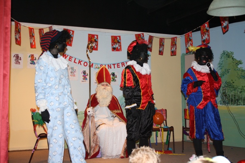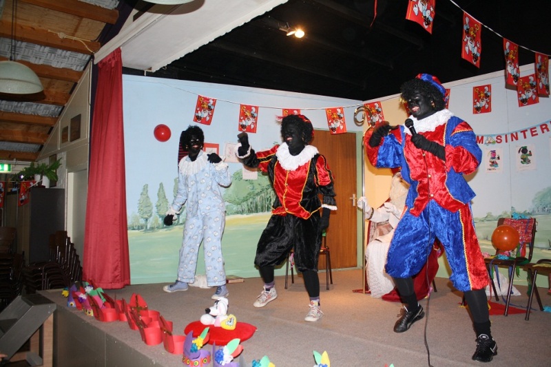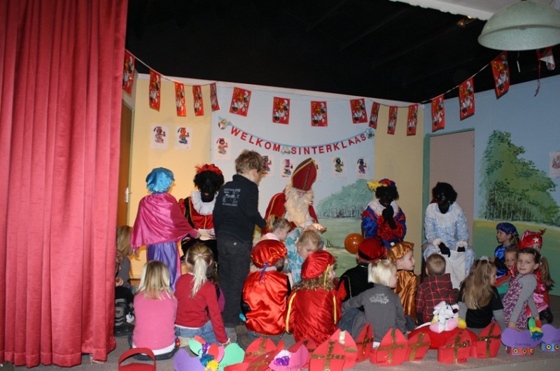 Deze Zwarte Piet was zo moe van elke nacht schoencadeautjes langs te brengen, dat hij zich had verslapen! Gelukkig wisten de andere zwarte pieten een goede oplossing. Om deze vermoeide piet weer lekker fit te krijgen, gingen ze met z´n allen pietengymnastiek doen! Samen met de Zwarte Pieten werd een hippe zwartepietendans ingestudeerd en toen de muziek begon te spelen, stond alle kinderen, ouders, juffen en meesters fanatiek mee te swingen. Zelfs de piet die zo moe was, voelde zich daarna weer helemaal top! Na deze energieke opening ging het feest voor de kinderen van groep 1 en 2 nog even door in de Bazuin. Na de pauze bracht Sinterklaas met zijn pieten nog een bezoek aan alle andere groepen op school. Daar werden ze door iedereen hartelijk ontvangen en werden er vele cadeaus en pepernoten uitgedeeld. Het was dit jaar weer een superfeest en we hopen Sinterklaas volgend jaar weer te mogen begroeten op de Bining.